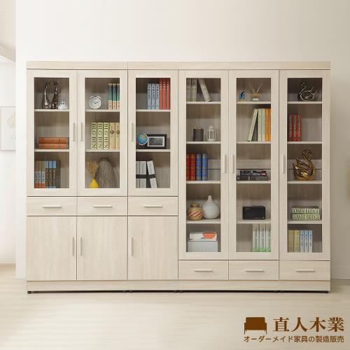 【直人木業】COCO奶油風玻璃書櫃組240公分(中二抽+中一抽+下二抽+下一抽)