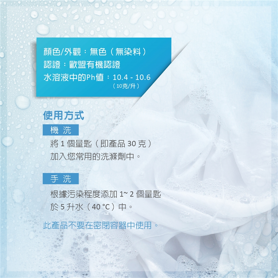 • 由於其氧化特性,可讓隨時間泛黃的舊衣回復原本的白色