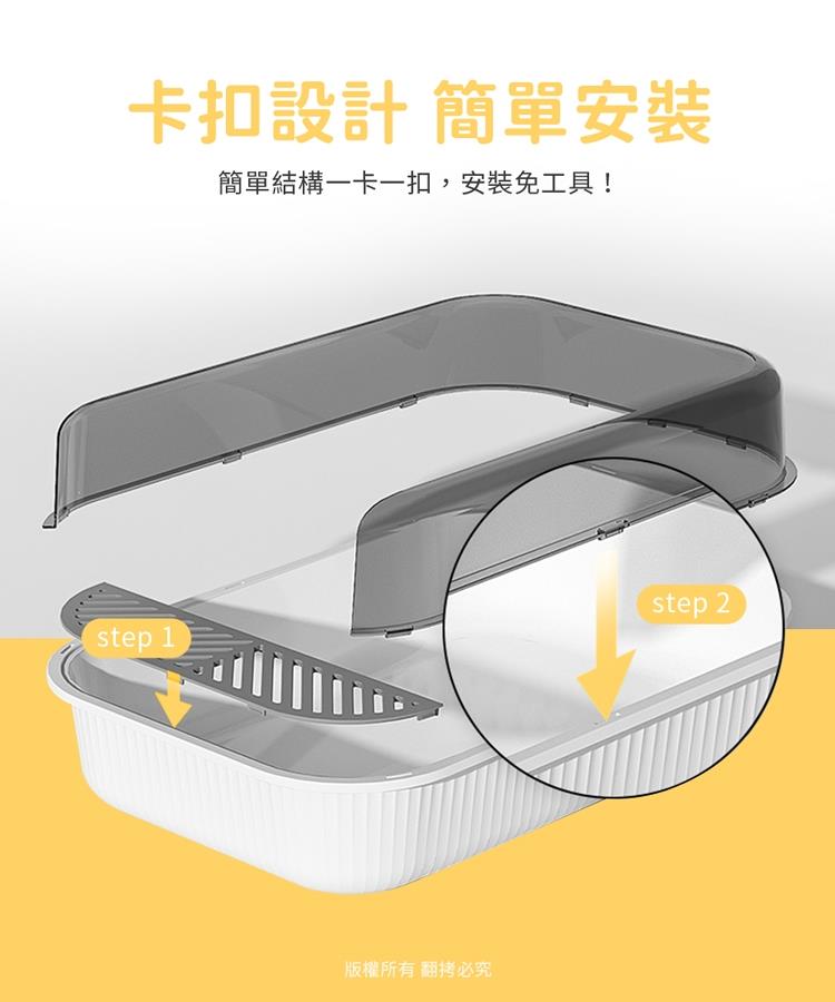 圍欄加高有效防止貓砂四處飛濺,搭配濾砂腳踏板設計,