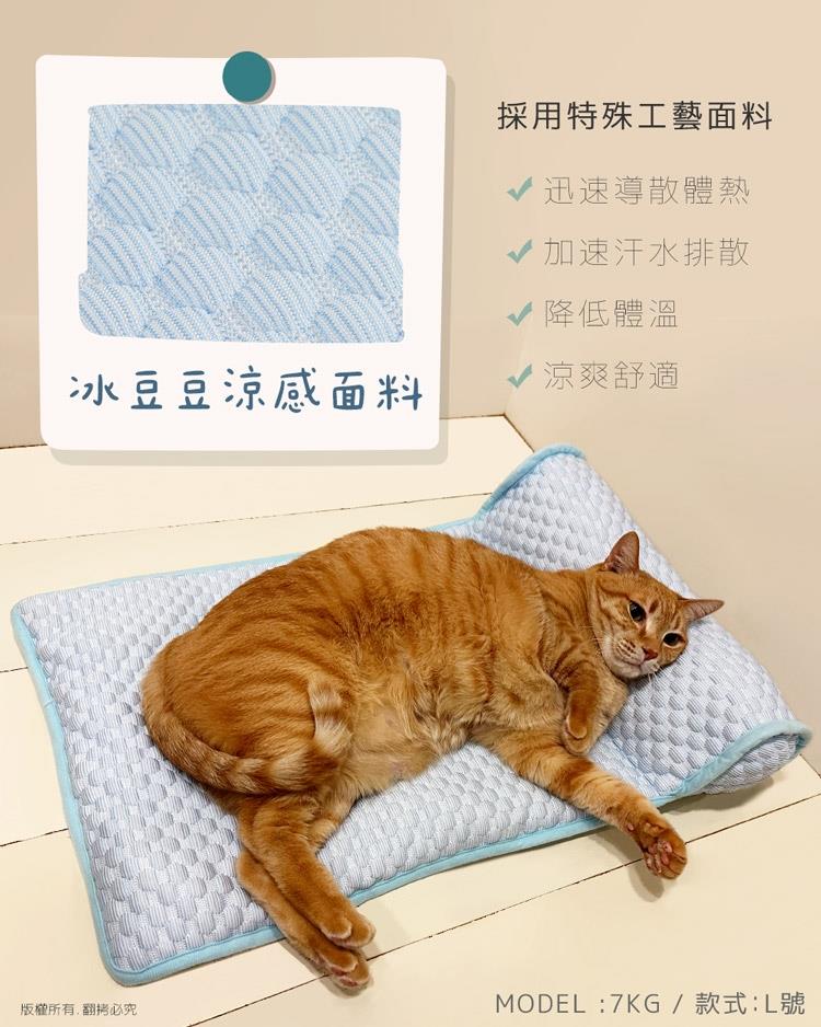 【冰豆豆涼感寵物墊】,採用冰豆豆涼感冰絲面料,