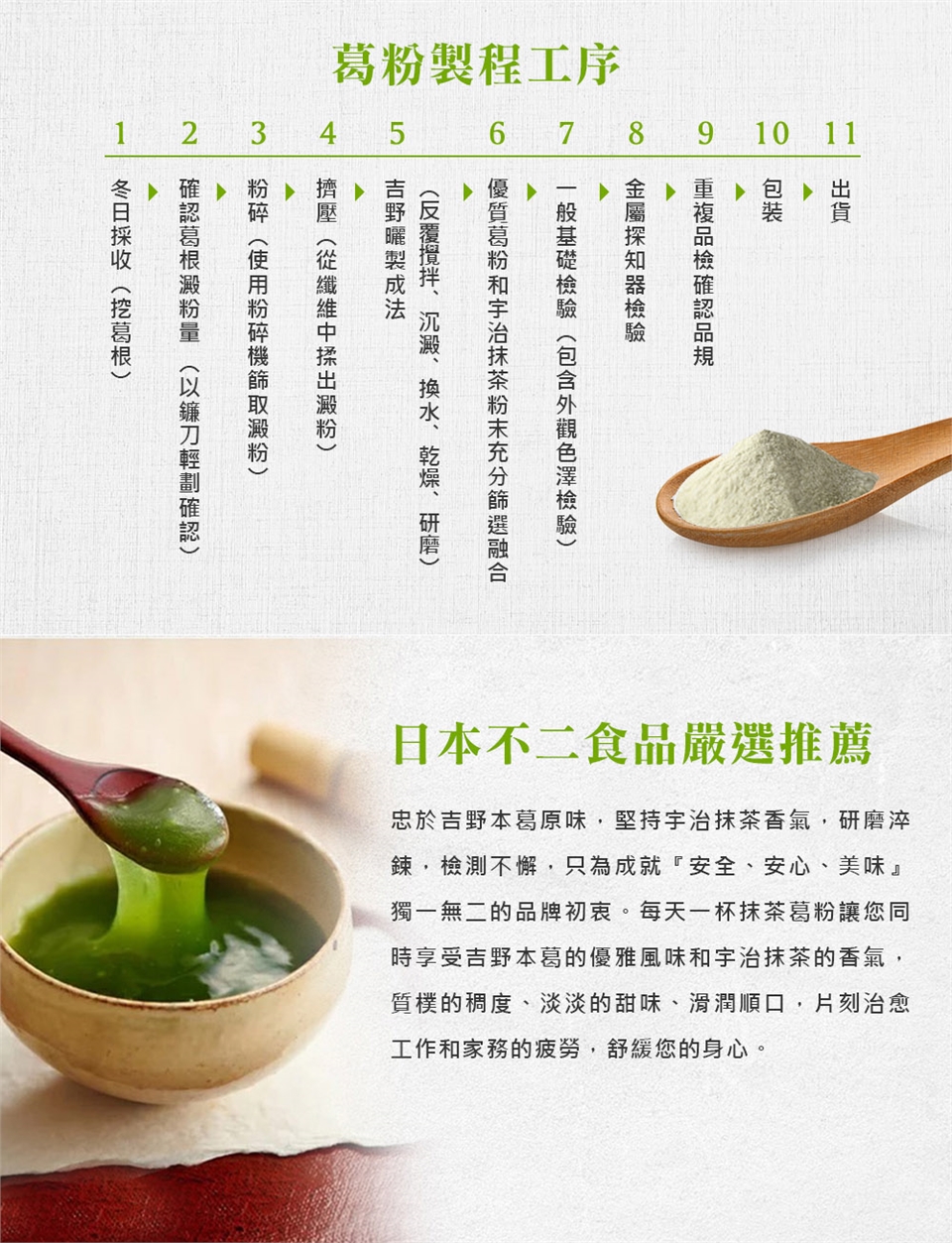 抹茶葛粉製成工序:吉野本葛葛粉和宇治抹茶粉末充分篩選混合→一般基礎品質檢驗(稱重、填裝,包含外觀色澤檢驗) →