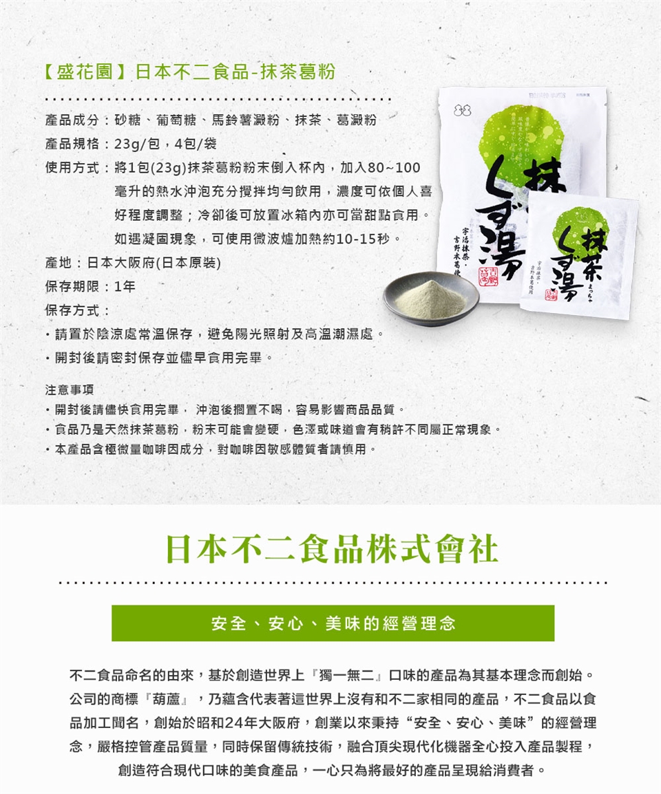 2.食品乃是天然抹茶葛粉,粉末可能會變硬,色澤或味道會有稍許不同屬正常現象。