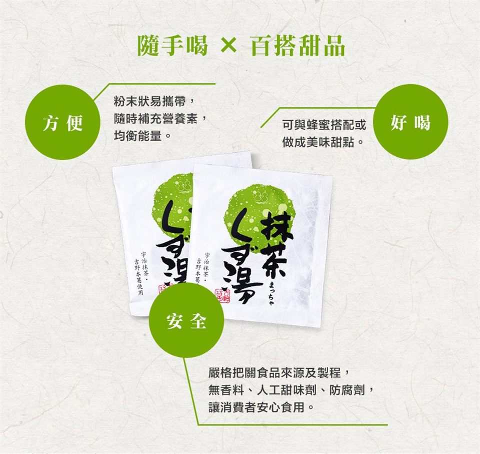 忠於吉野本葛原味,堅持宇治抹茶香氣,研磨淬鍊,檢測不懈,只為成就『安全、安心、美味』獨一無二的品牌初衷。
