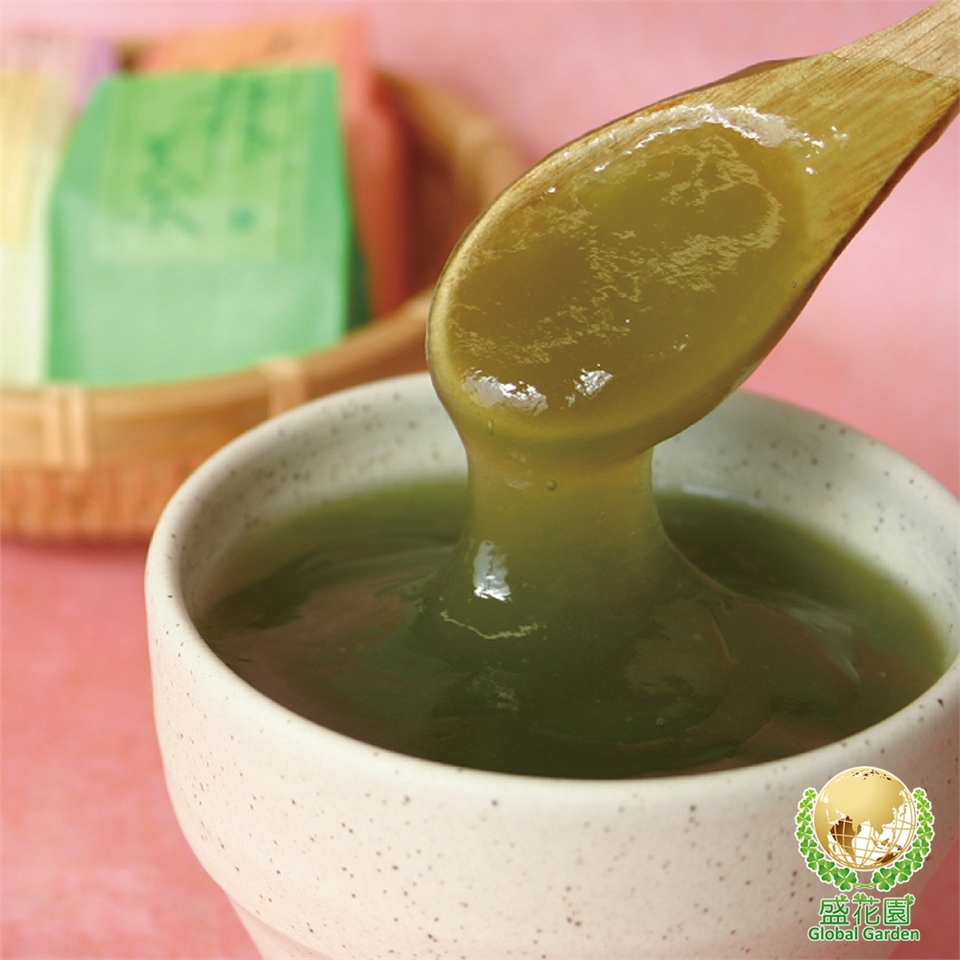 2.加入熱水製作後,放入冰箱冷卻(1~2小時),略呈透明凝固狀,可搭配各式餡料(例如: 冰淇淋、紅豆等)可作為甜點享用。