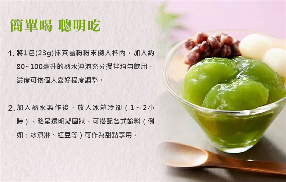 1.將1包(23g)抹茶葛粉粉末倒入杯內,加入約80~100毫升的熱水沖泡充分攪拌均勻飲用,濃度可依個人喜好程度調整。