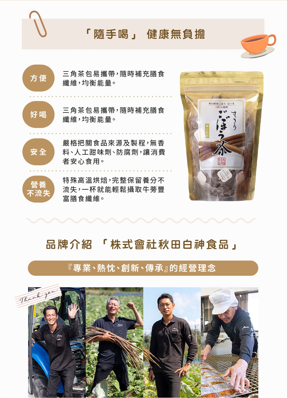 秋田白神(清爽)Sukkiri牛蒡茶採用帶皮牛蒡根,以獨創焙燒法精心焙炒、研磨而成口感香醇、清甘易飲、無澀味的牛蒡茶;