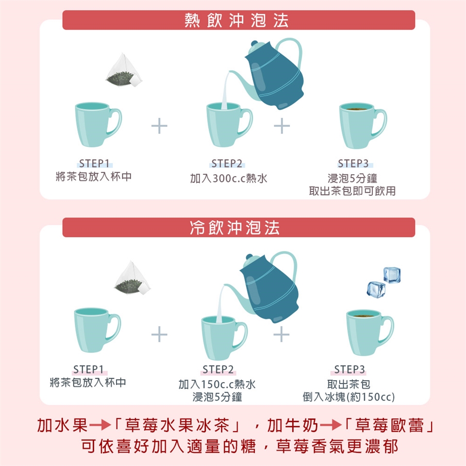 【熱泡】1顆茶包加入250cc~300cc熱水,浸泡3~5分鐘後取出茶包即可飲用。可依喜好濃淡調整水量時間或加糖/冰塊飲用。