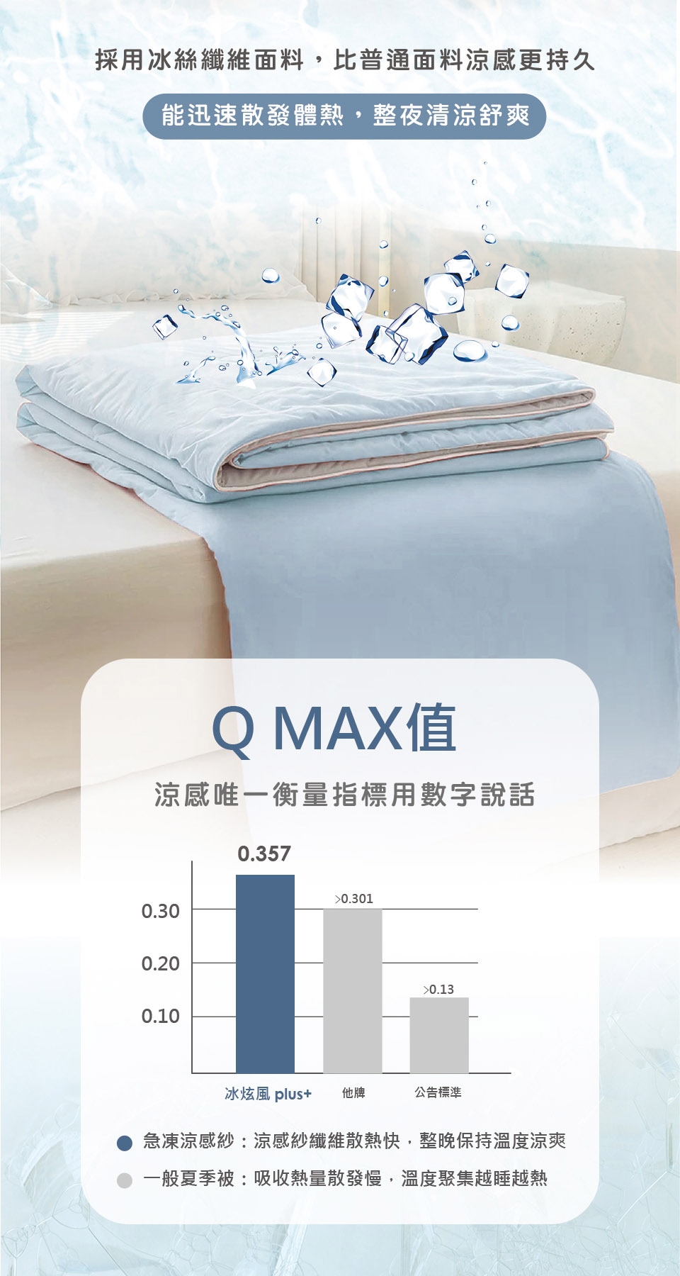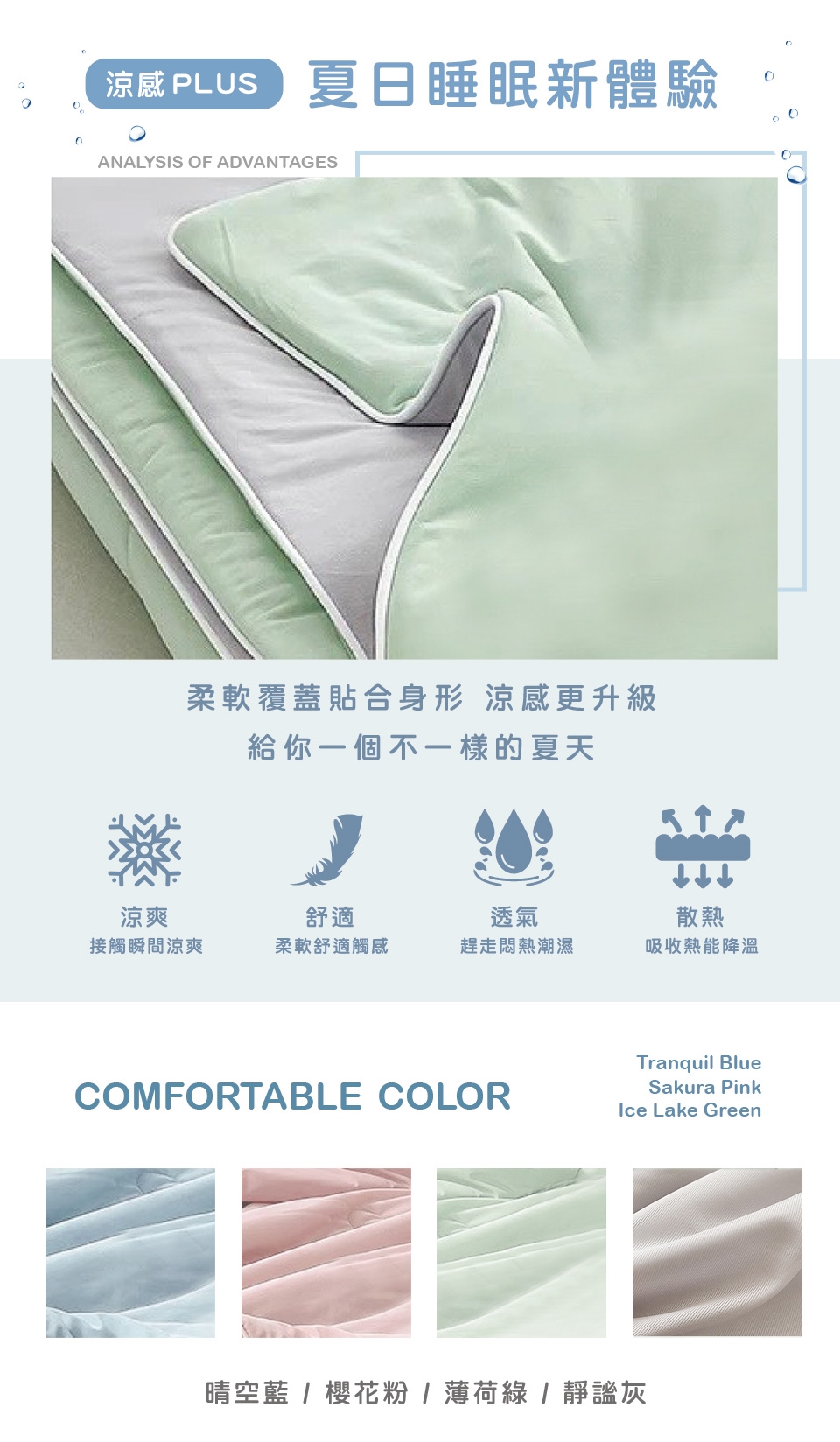 ♫ 雙面涼感 - COOL MAX雙重冷感技術“接觸瞬間涼爽”,入睡帶來持續涼感更舒適。