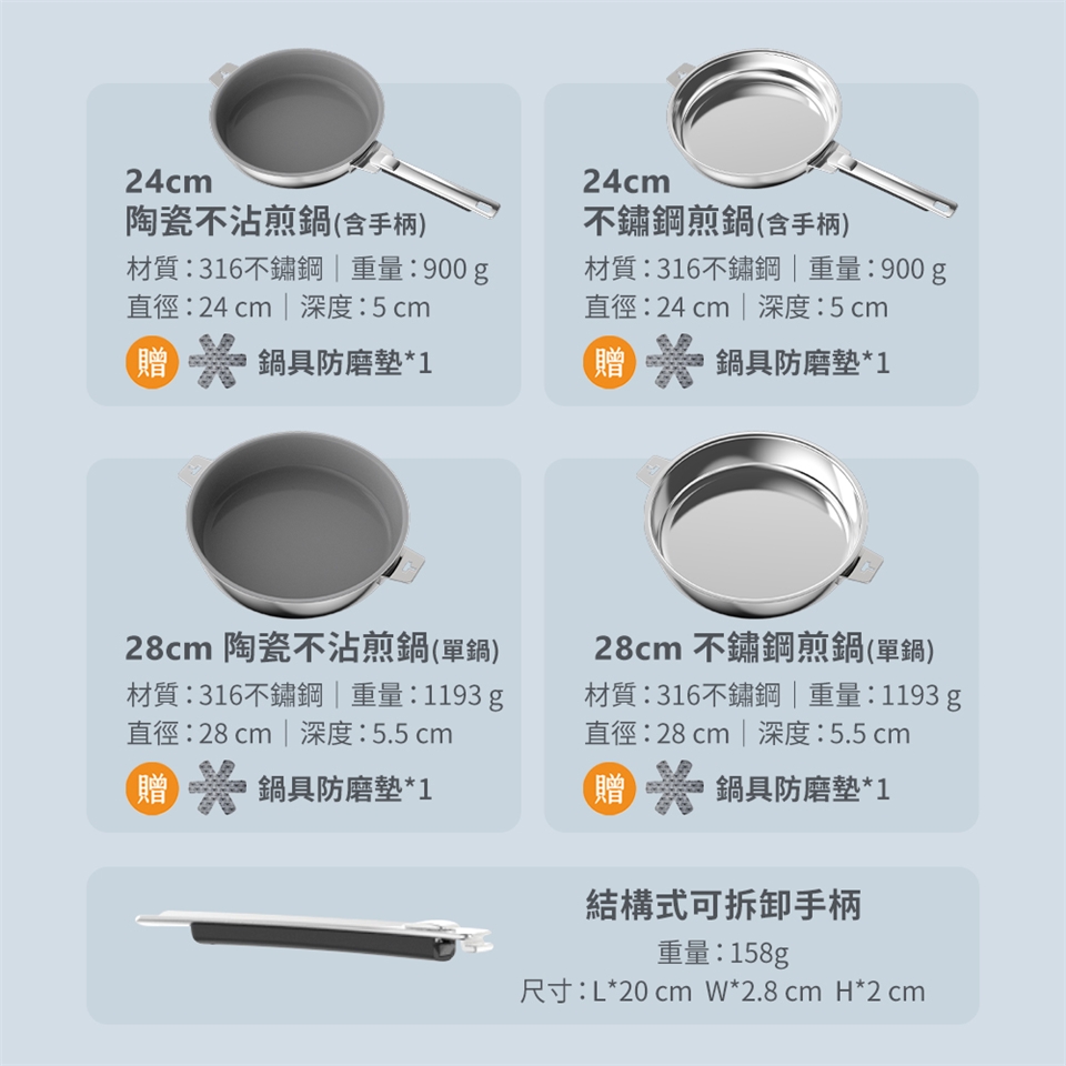 材質:不鏽鋼煎鍋: 316不鏽鋼/可拆卸手柄: 不鏽鋼、電木