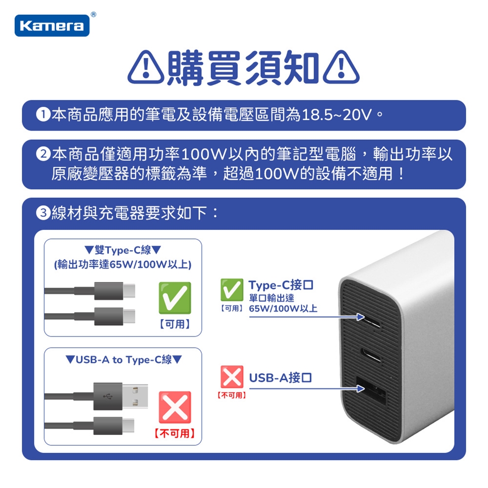 ※本商品最高支援100W,超過100W筆電不適用,為避免造成過載或無法充電使裝置損壞,請勿使用。