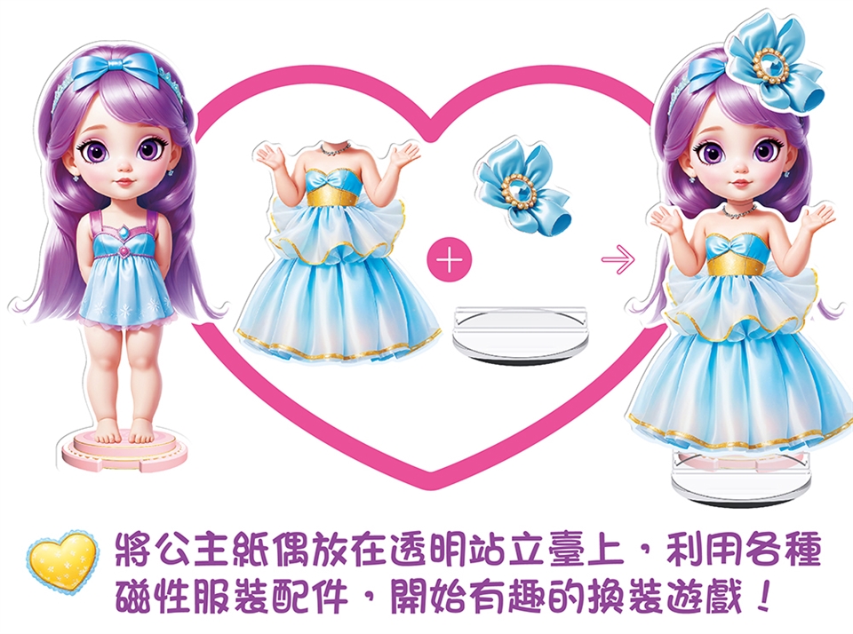 將公主紙偶放在站立臺上,開始動手搭配美麗又獨特的造型,可盡情發揮創造力,利用換裝磁性貼打造出獨一無二的美麗公主。
