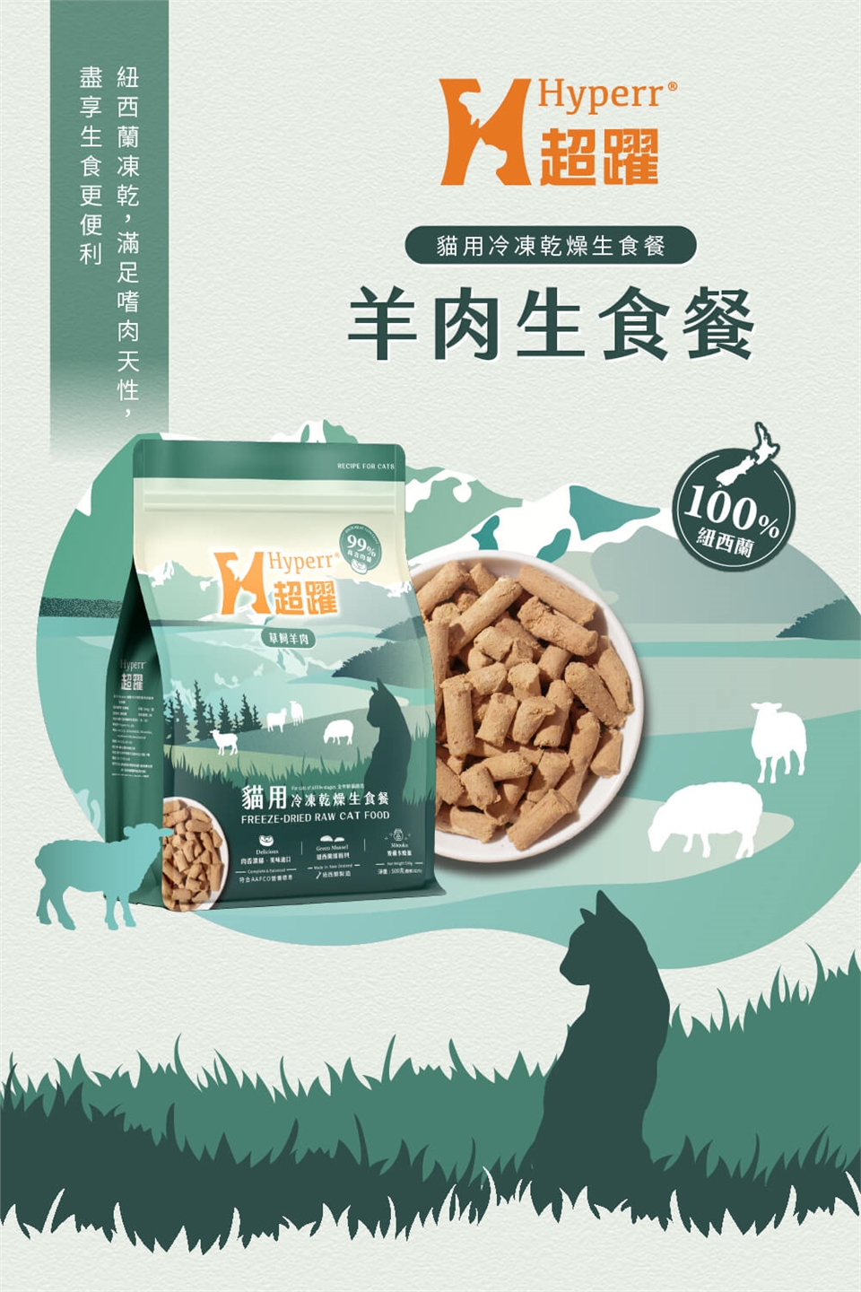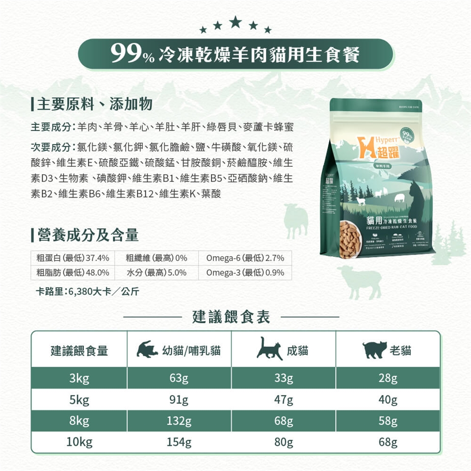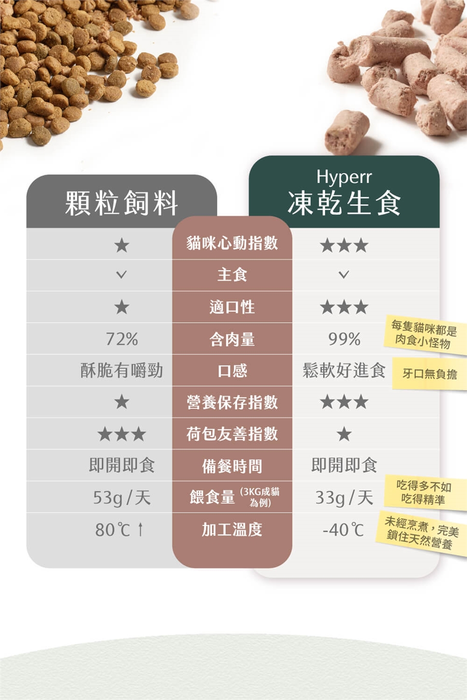 可作為主食、佐餐或零食,多樣吃法。若首次將Hyperr超躍生食餐作為主食,請依比例循序更換,並在7-10天慢慢的與當前飲食混合。