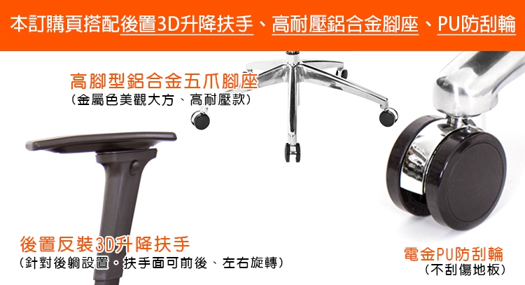 本訂購頁規格:後置3D升降扶手、山形鋁合金腳、PU防刮輪