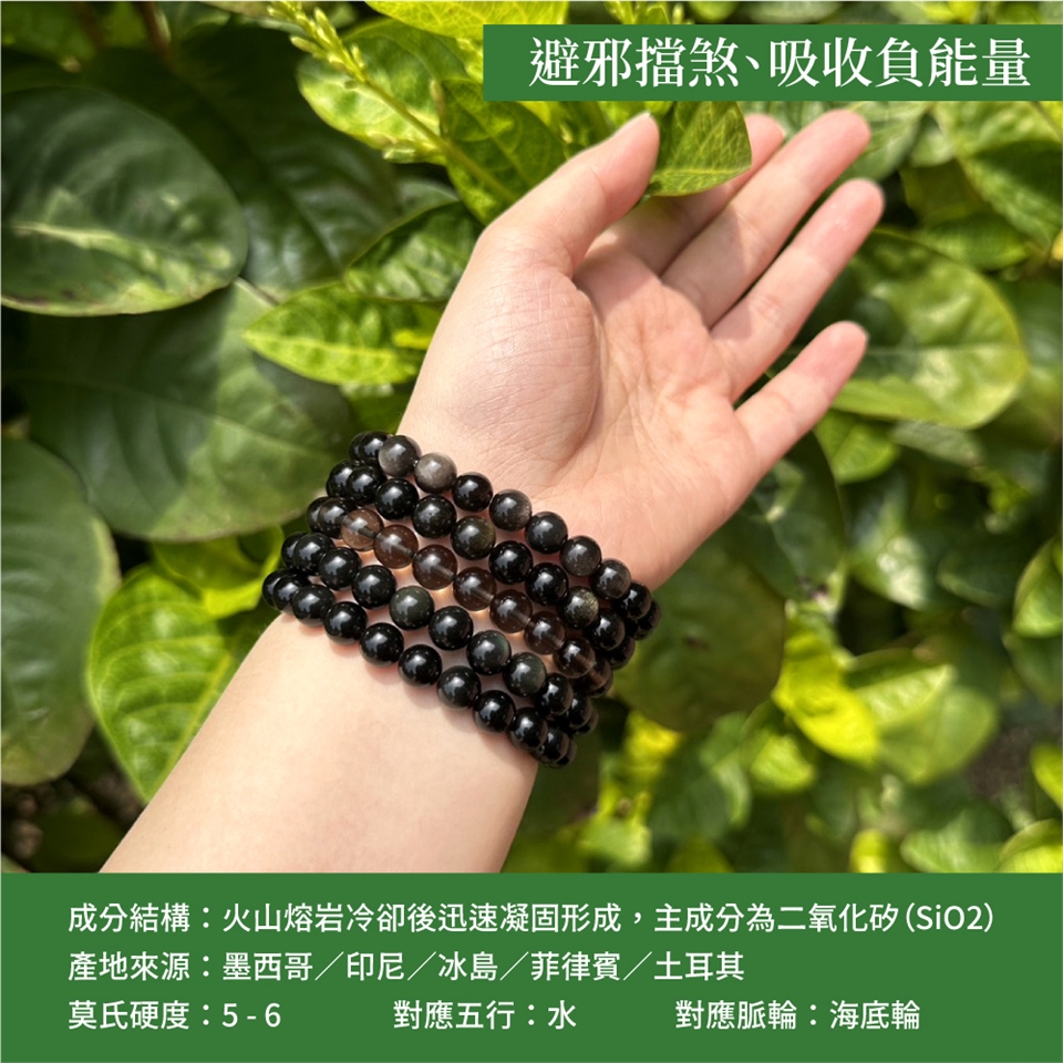曜石分為許多種類,其中最常見的為黑曜石,整體極黑色的結晶,銀曜石帶有銀白色的閃光晶體,金曜石為金色的光澤,彩虹曜石與單眼黑曜石主要比較難以區分,因火山噴發後晶體會因不同溫度受熱產生寶石光暈,並以單一顆圓珠為基準,判斷是否單一顆珠體有雙閃光反光光暈為準。所有曜石類皆為最強極度避邪寶石,許多佛像神明都有用黑曜石雕刻而成,首飾中也是避邪佼佼者。