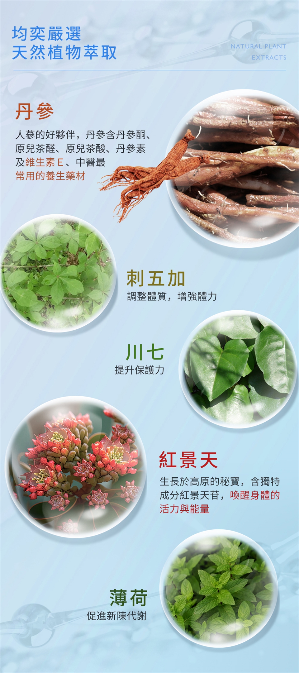 成份:生鮮丹參萃取物、紅景天萃取物(含麥芽糊精)、生鮮刺五加萃取物、川七葉萃取物、薄荷。