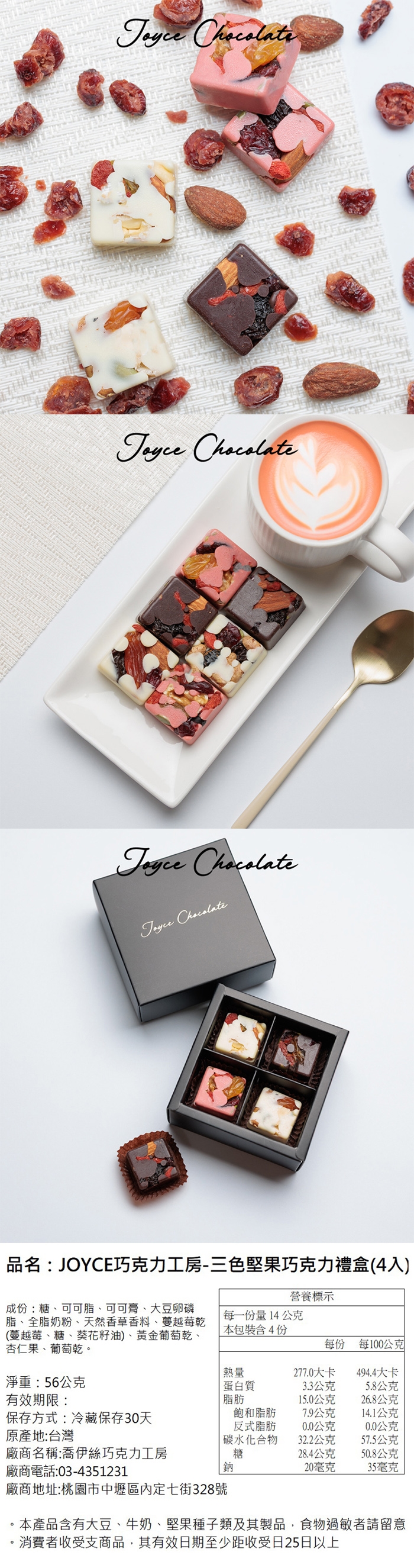 ※草莓巧克力堅果成份:糖、可可脂、大豆卵磷脂、全脂奶粉、天然香草香料、草莓萃取液、蔓越莓乾(蔓越莓、糖、葵花籽油)、黃金葡萄乾、杏仁果、葡萄乾
