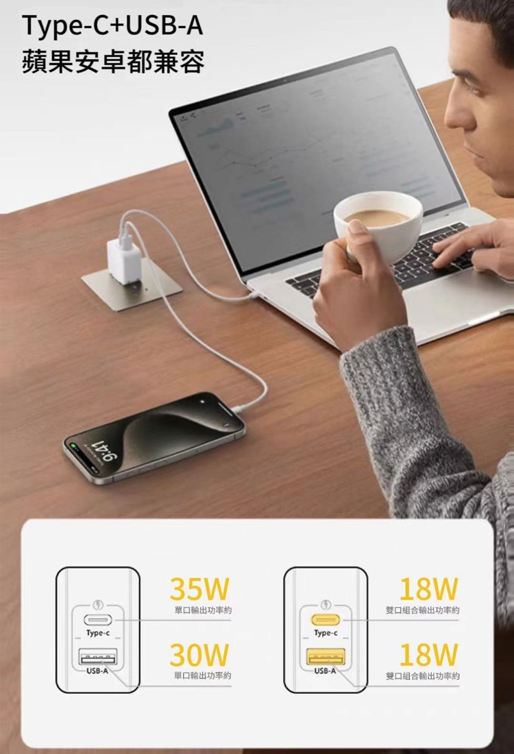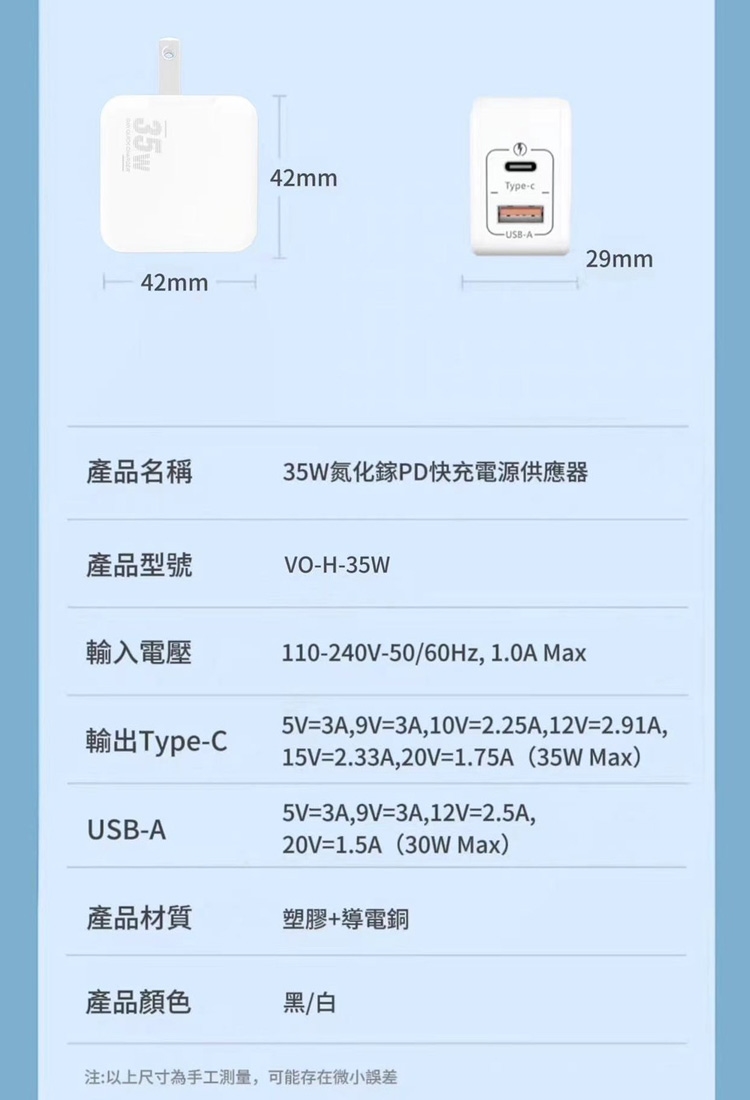 輸出電流 : Type-C:5V=3A,9V=3A,10V=2.25A 35WMaxUSB:5V=3A30WMax