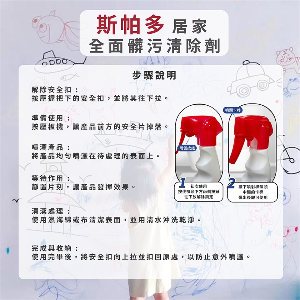 • 使用完畢可將安全扣向上拉後扣回原處,防止不小心噴灑。