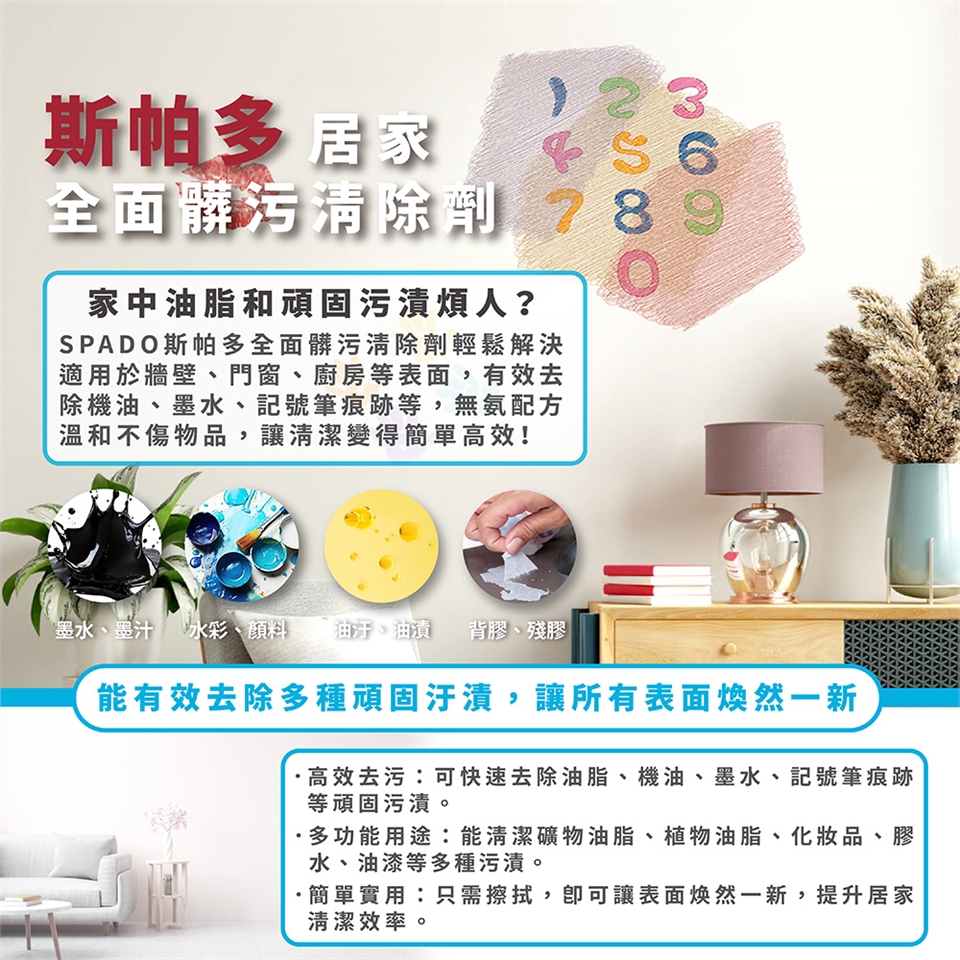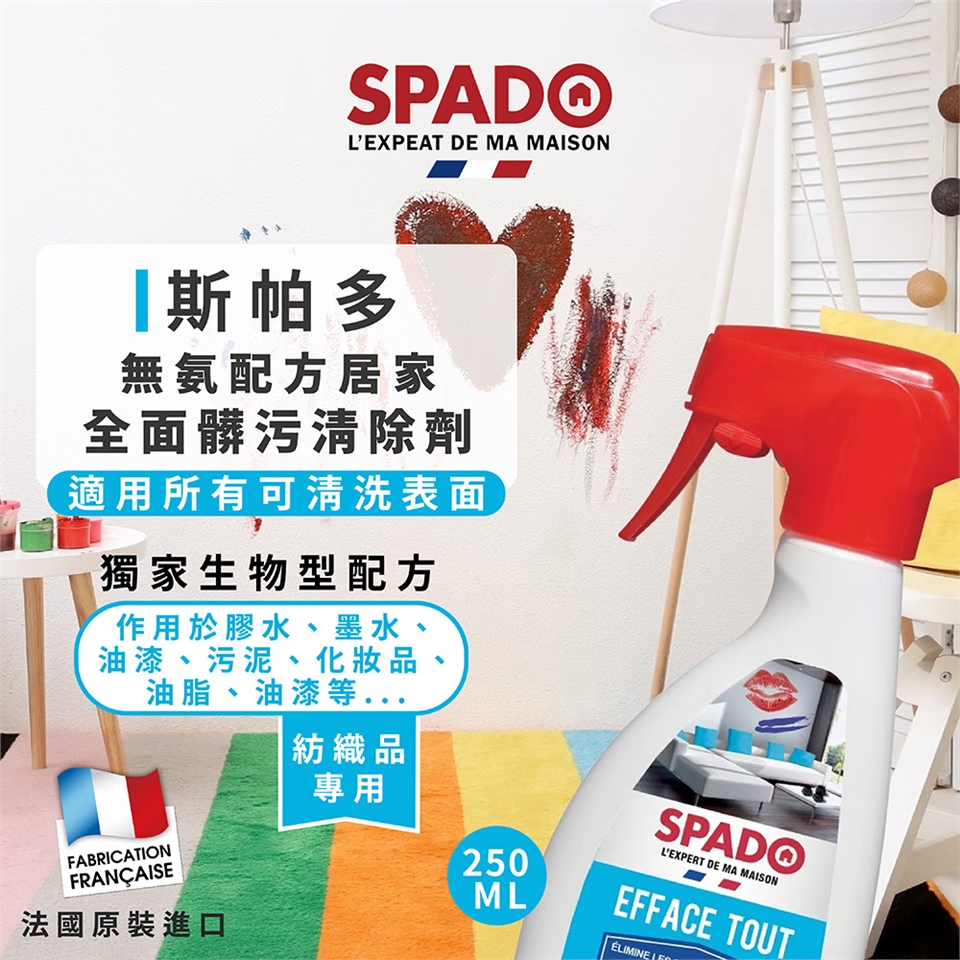 SPADO斯帕多全面髒污清除劑適用範圍:礦物油脂(機油、油脂、尼古丁等)、植物油脂(油、黃油等)、化妝品、鞋子、墨水、記號筆、膠水、油漆等痕跡。所有可擦拭的表面:光滑的牆壁、電燈開關、門、窗、百葉窗、花園家具和 PVC 地板、踢腳線等。非常適合房屋內外(廚房、客廳、車庫、車間、露台等)。