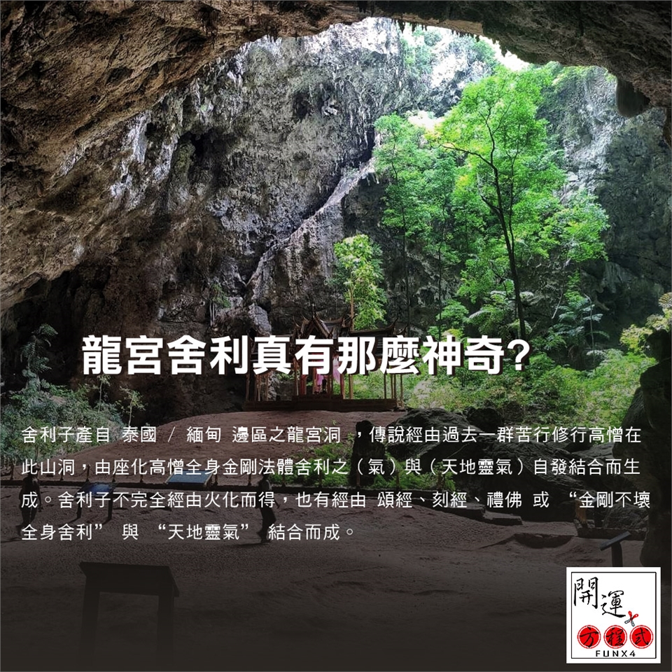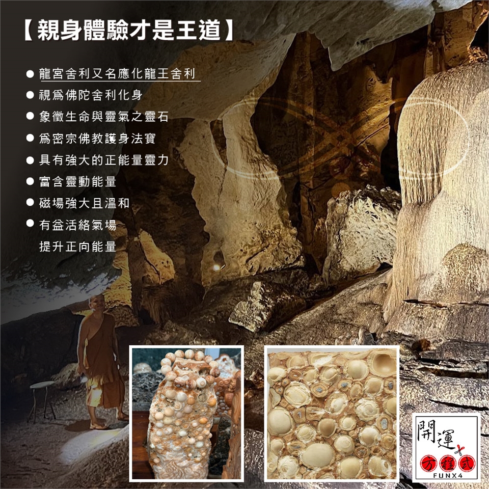 一顆充滿神祕與力量的結晶體,祂是宇宙最神秘力量的總稱,也是傳奇,更是完美的總合 ‘龍宮舍利’:堅固晶體經化驗密度高達9,比藍寶石密度高,且具增長能量。由於龍宮舍利子被視為神聖之物,所以很少有關其成分的鑒定。對於其成分尚有部份無法測出,至今還沒有確切的定論。硬度可造假(科技)密度假不了。龍宮舍利形狀、顏色甚多,以圓形最為珍貴。