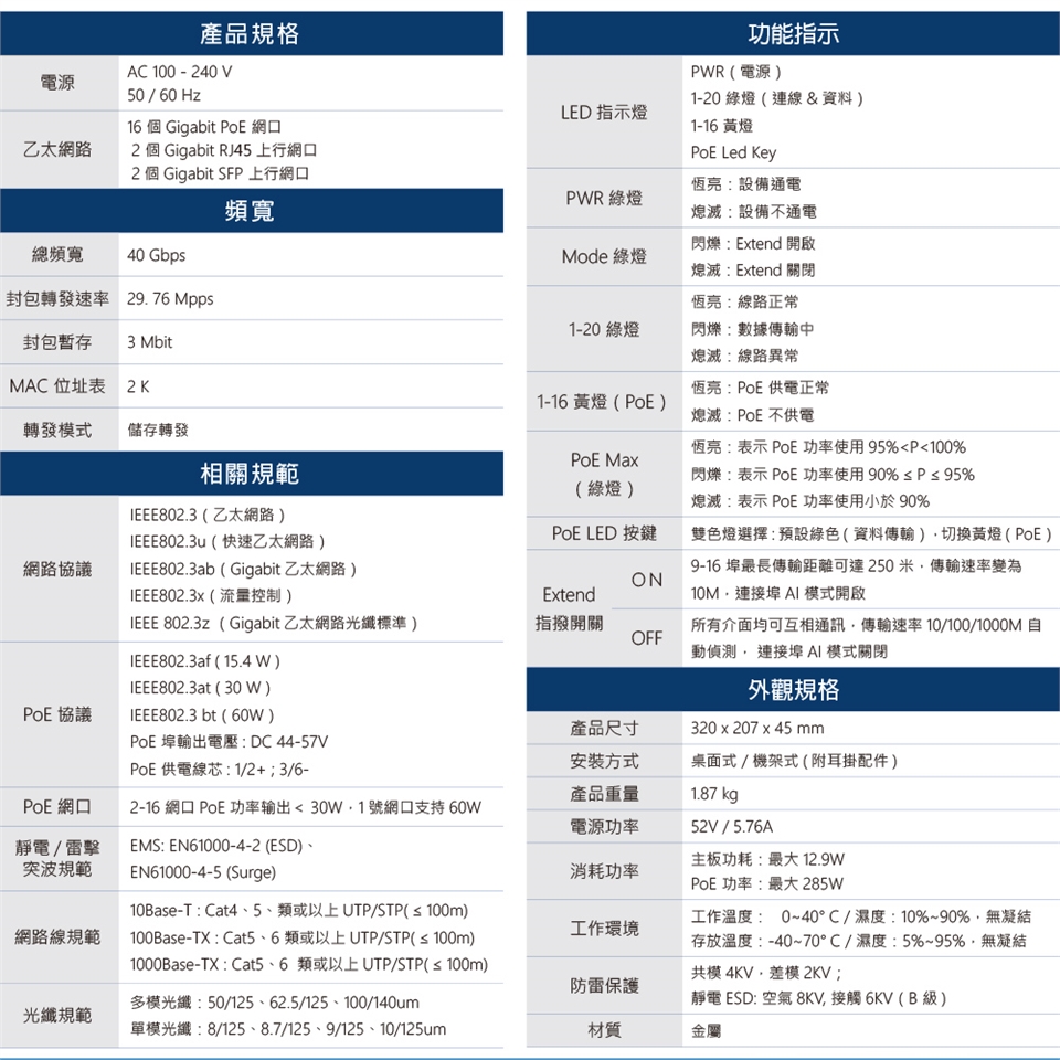 ■ 16 個 Gigabit PoE 網口 + 2 個 Gigabit RJ45 上行網口 + 2 個 Gigabit SFP 上行網口