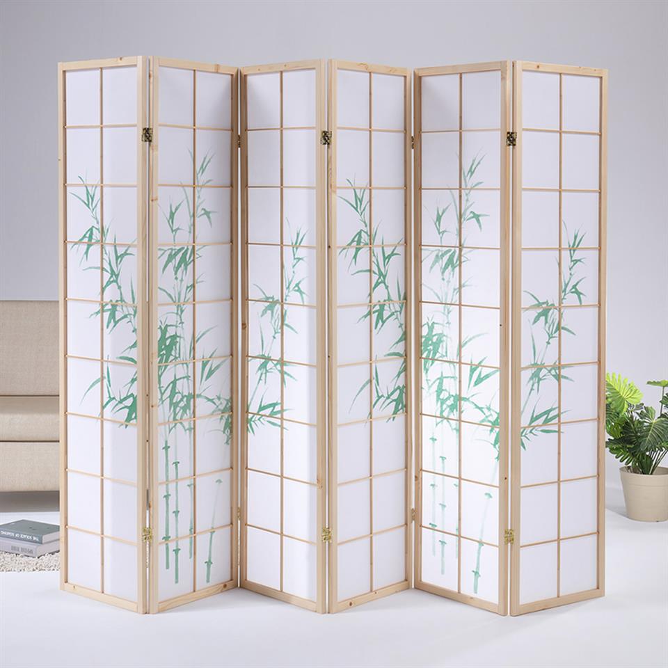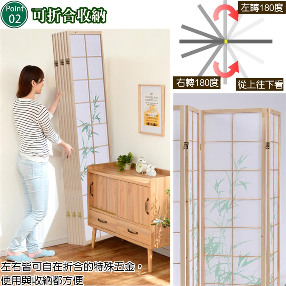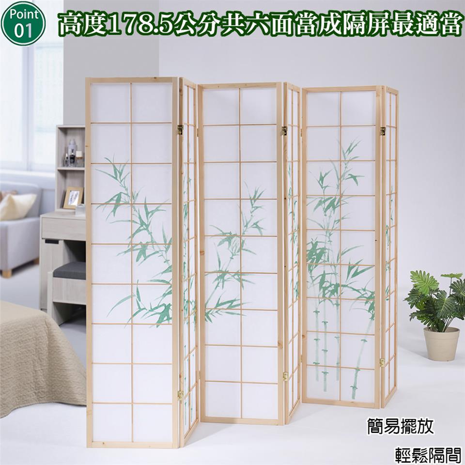每面十八格的天然木格搭配高質感純白不織布,比起傳統的和紙更不易破,透光性佳可適度採光,象徵高風亮節與步步高升的綠竹圖案,輕易營造出中式或和風的風情,可任意折合的特殊五金,想怎麼折都可以,各種角度皆可調整,能夠讓六面屏風依您的需要做成任何造型來擺放,屏風也變成是一種裝飾,輕易提升居家氛圍。不使用的時候,也可以輕鬆折合快速收納,牆角、床底、沙發底下都能收納不占空間。