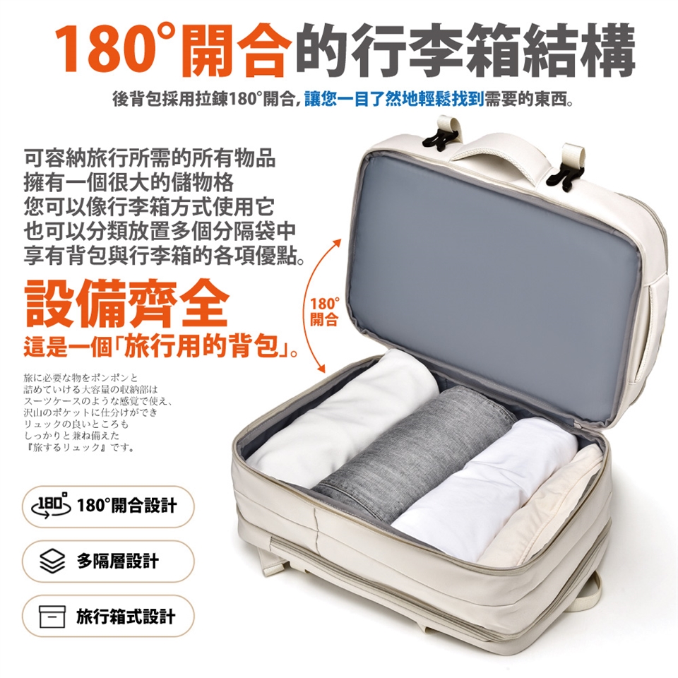 ◆ 採用行李箱式180度開合結構、方便收納換洗衣物、可登機使用