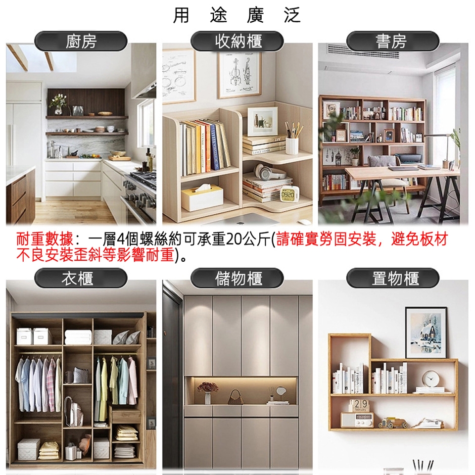 ◆耐重數據:一層4個螺絲約可承重20公斤(請確實勞固安裝,避免板材不良安裝歪斜等影響耐重)
