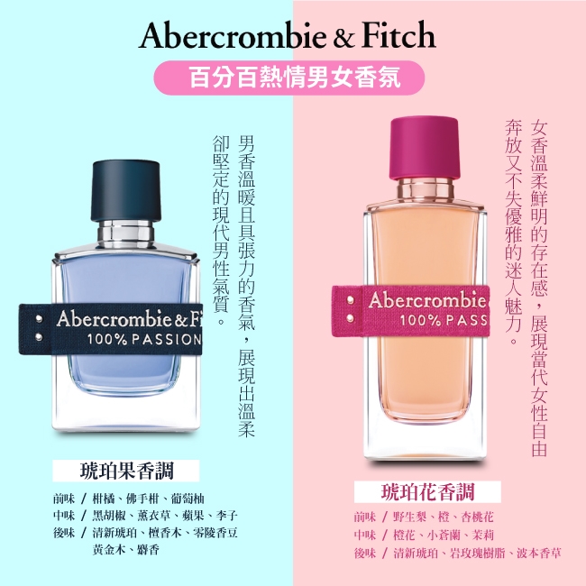 100% PASSION 百分百熱情男女香氛,皆以琥珀為核心,為男女帶來截然不同卻彼此呼應的氣味詮釋。