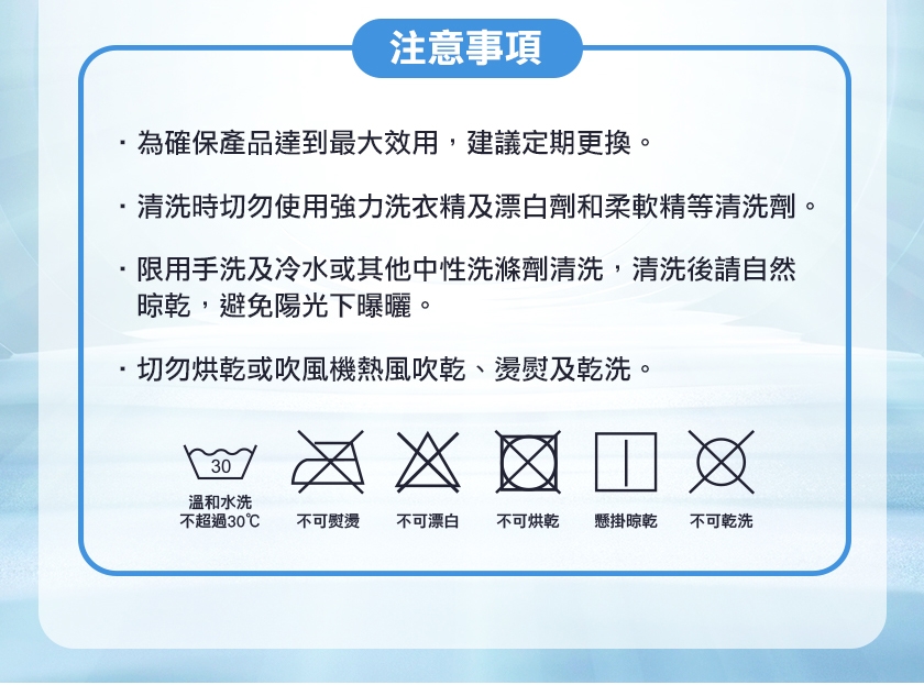 3.限用手洗及冷水或其他中性洗滌劑清洗,清洗後請自然晾乾,避免陽光下曝曬。