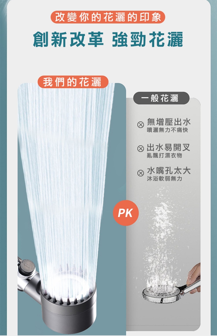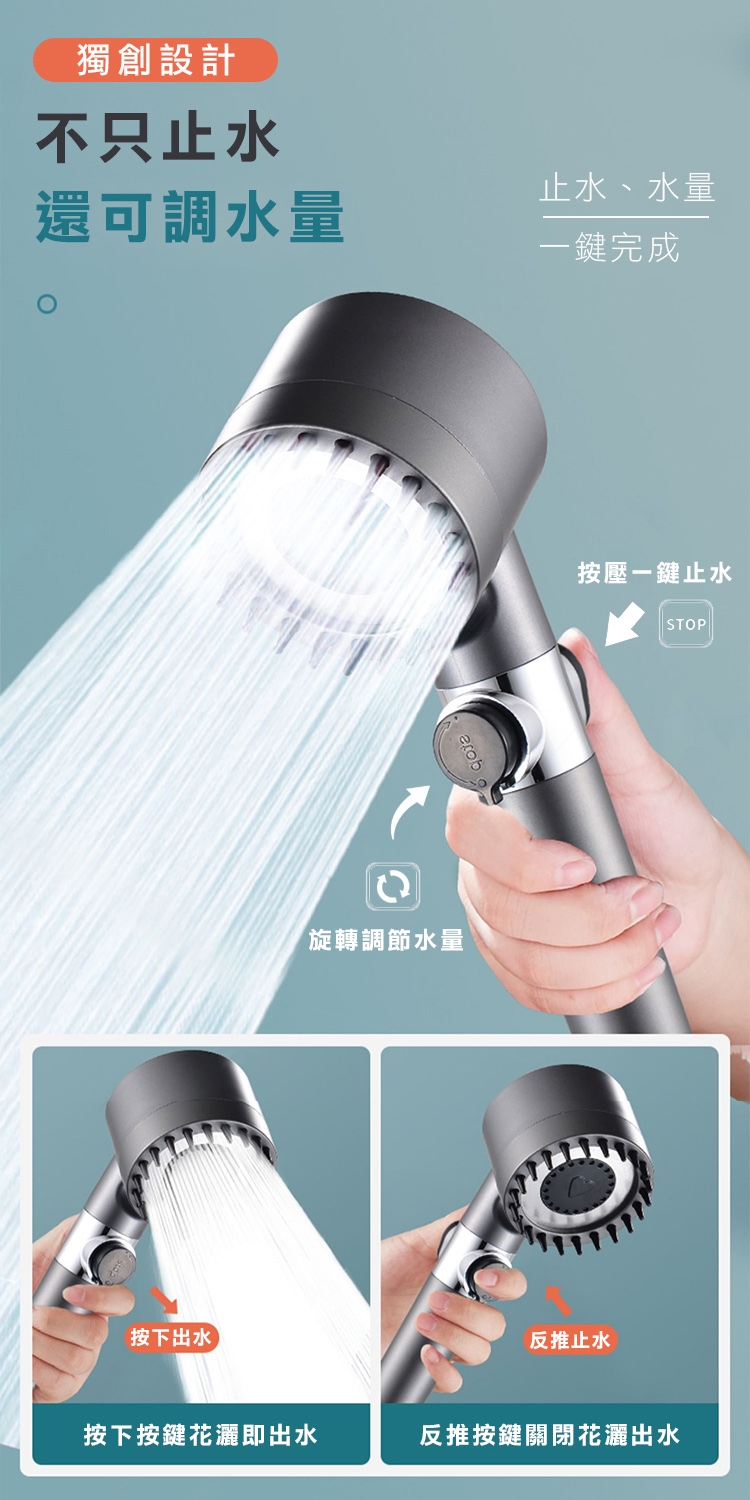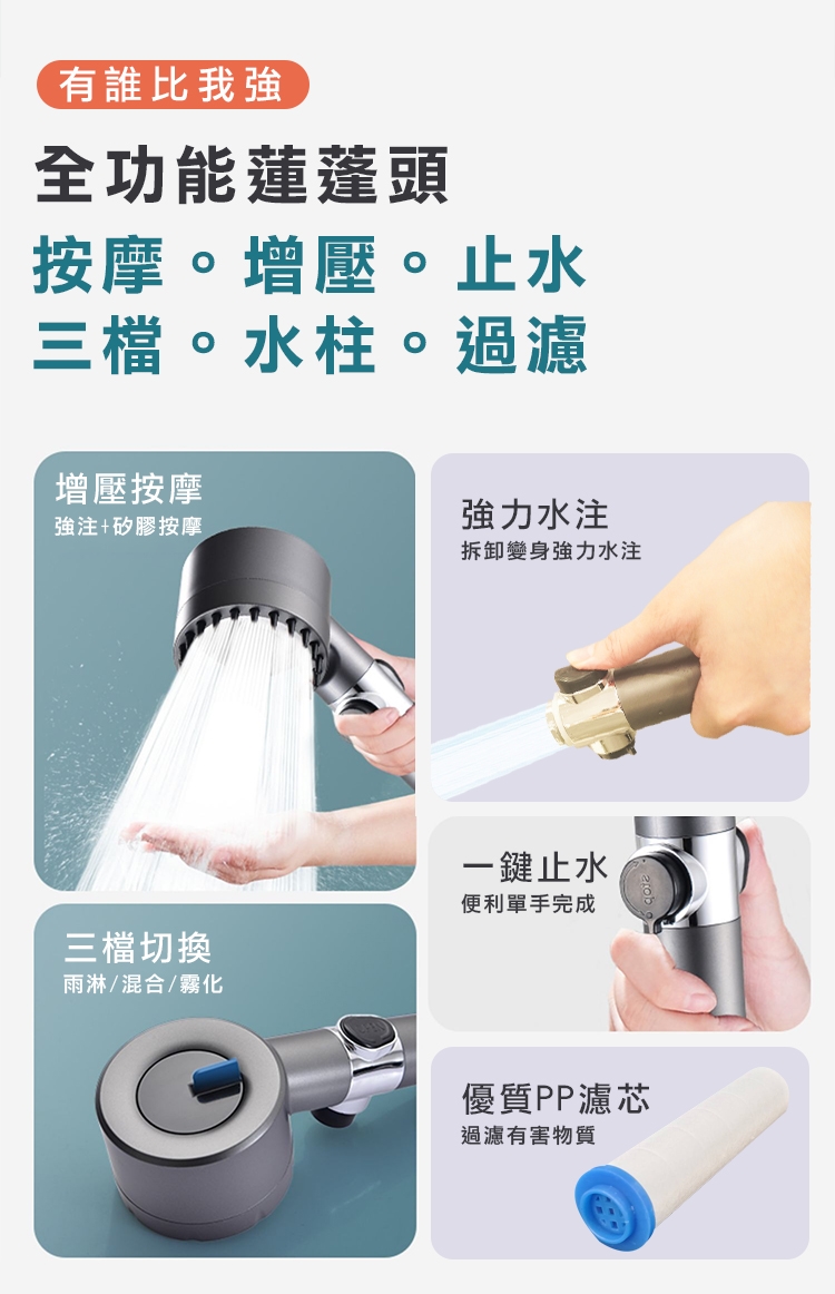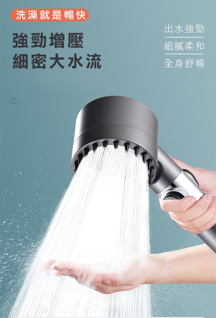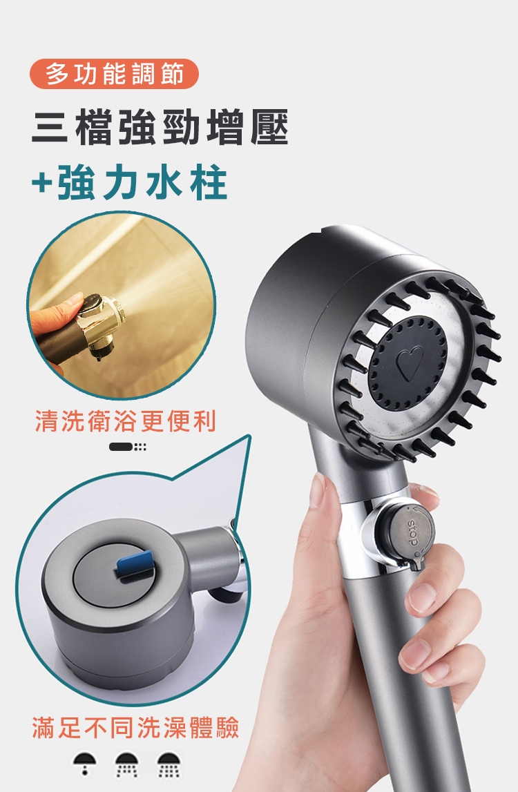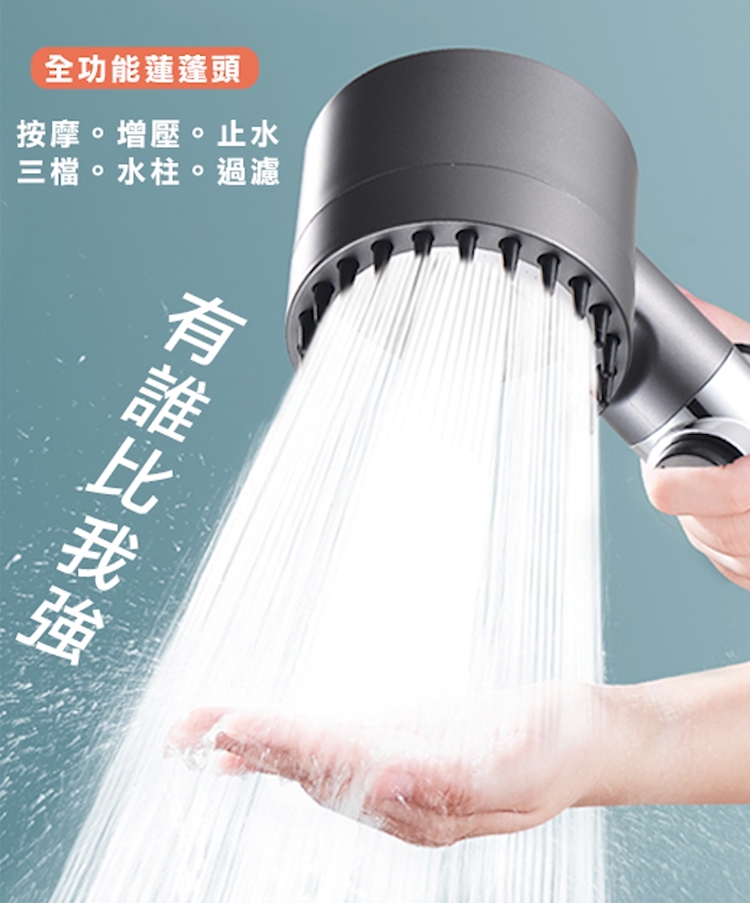 家中水壓總是不夠,按摩增壓過濾止水三檔蓮蓬頭,三檔增壓滿足淋浴快感,拆除花灑頭變身強力水柱,清潔更便利,單手一鍵止水還可調水量,獨創矽膠按磨促進血液循環,高效PP濾芯淋浴更安心,全功能蓮蓬頭"戴噴"就是給你不同淋浴體驗!