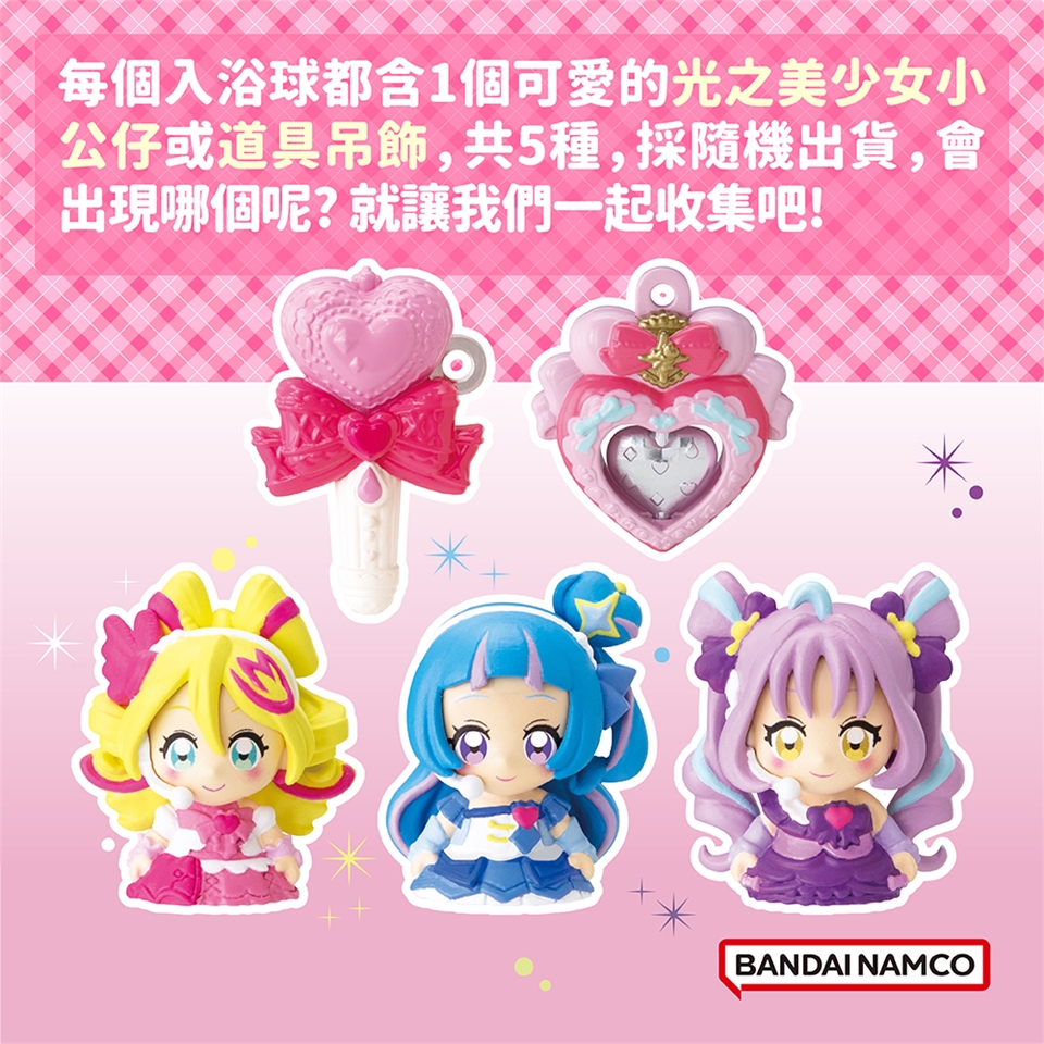 每個入浴球都含1個可愛的光之美少女小公仔或道具吊飾,共5種,採隨機出貨,會出現哪個呢? 就讓我們一起收集吧!