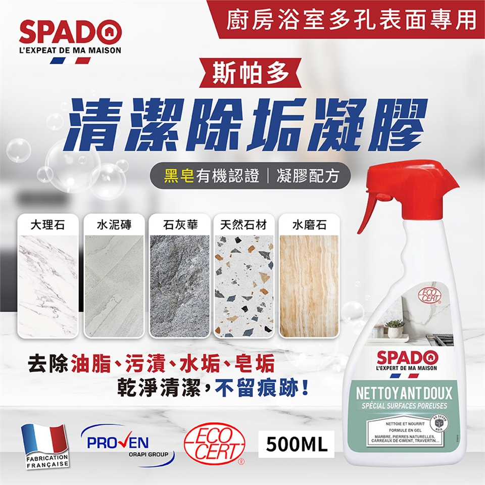 這時候就使用 SPADO斯帕多 歐盟有機認證 廚房浴室多孔表面專用温和清潔凝膠!