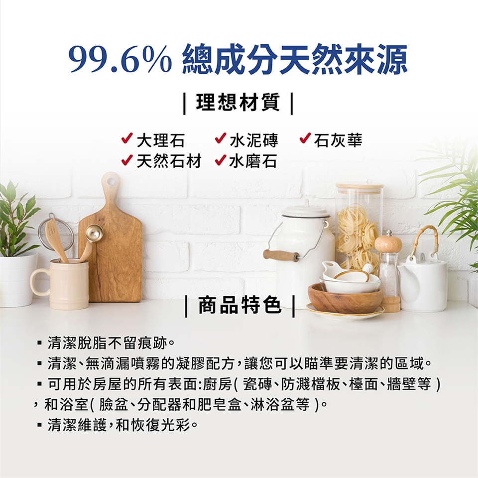 可用於房屋中的所有表面:廚房(瓷磚、防濺板、工作檯面、牆壁等)和浴室(面盆、分配器和肥皂盤、淋浴盤等)為【歐盟有機認證的產品】。