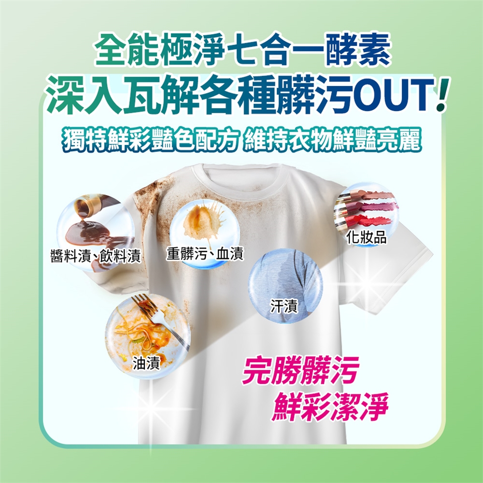 【全能極淨酵素 去汙力再升級】全新七合一酵素深入衣物纖維,有效去除髒污頑垢。獨特鮮彩豔色配方,能形成保護膜,維持衣物鮮豔亮麗。