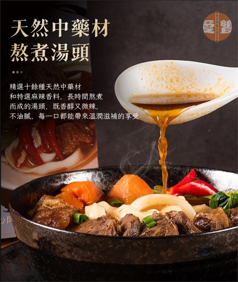 - 天然中藥材湯頭:十種中藥與天然香料熬煮,香醇微辣,帶來溫潤滋補的享受。