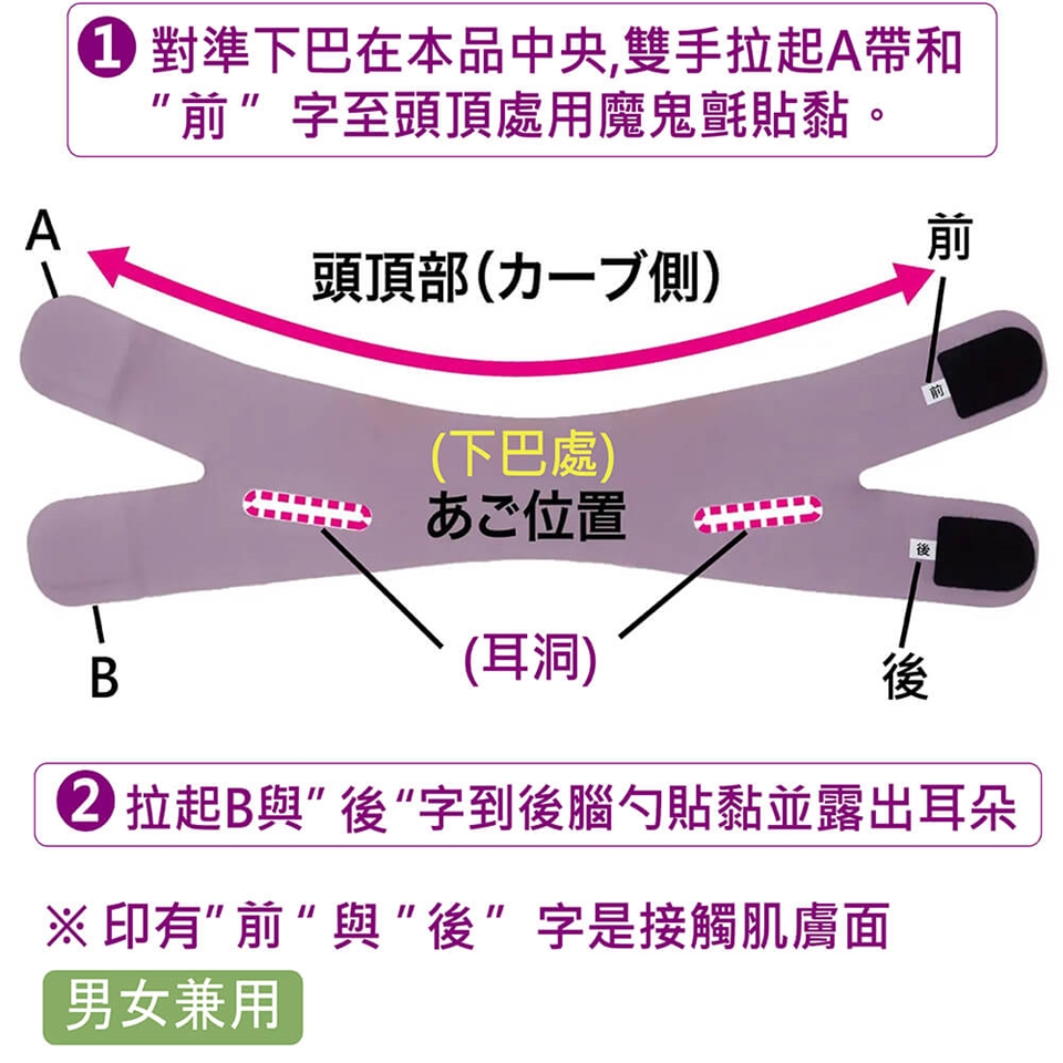 1.下巴放在本品中央,雙手拉起A和"前"至頭頂處用魔鬼氈貼黏。