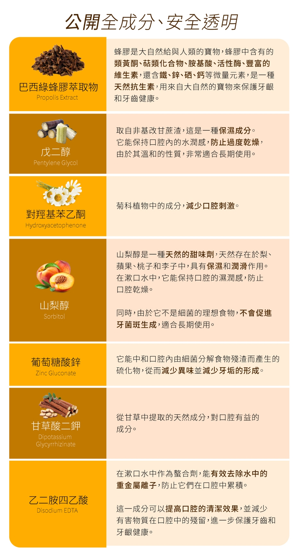 像水一樣透徹,只有淡淡的蜂膠味,沒有刺鼻的化學味!超溫和,好漱口!讓您一用再用!