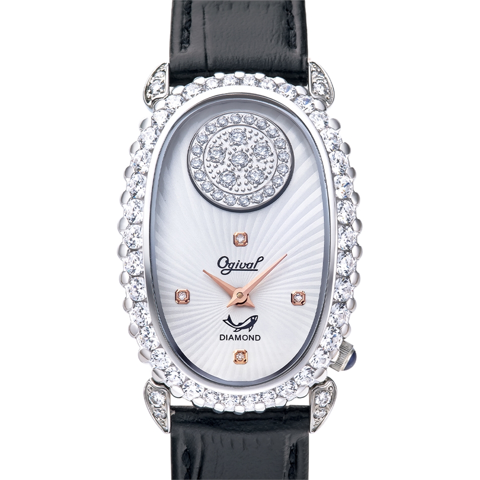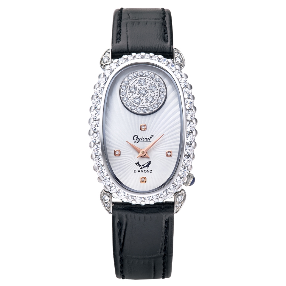【Ogival 愛其華】璀璨真鑽優雅時尚腕錶 白鑽面黑帶