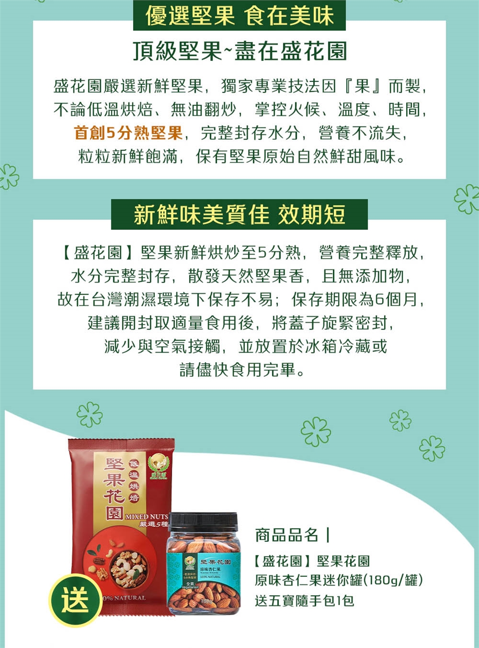 盛花園嚴選新鮮堅果,獨家專業技法因『果』而製,不論低溫烘焙、無油翻炒,掌控火候、溫度、時間,首創5分熟堅果,