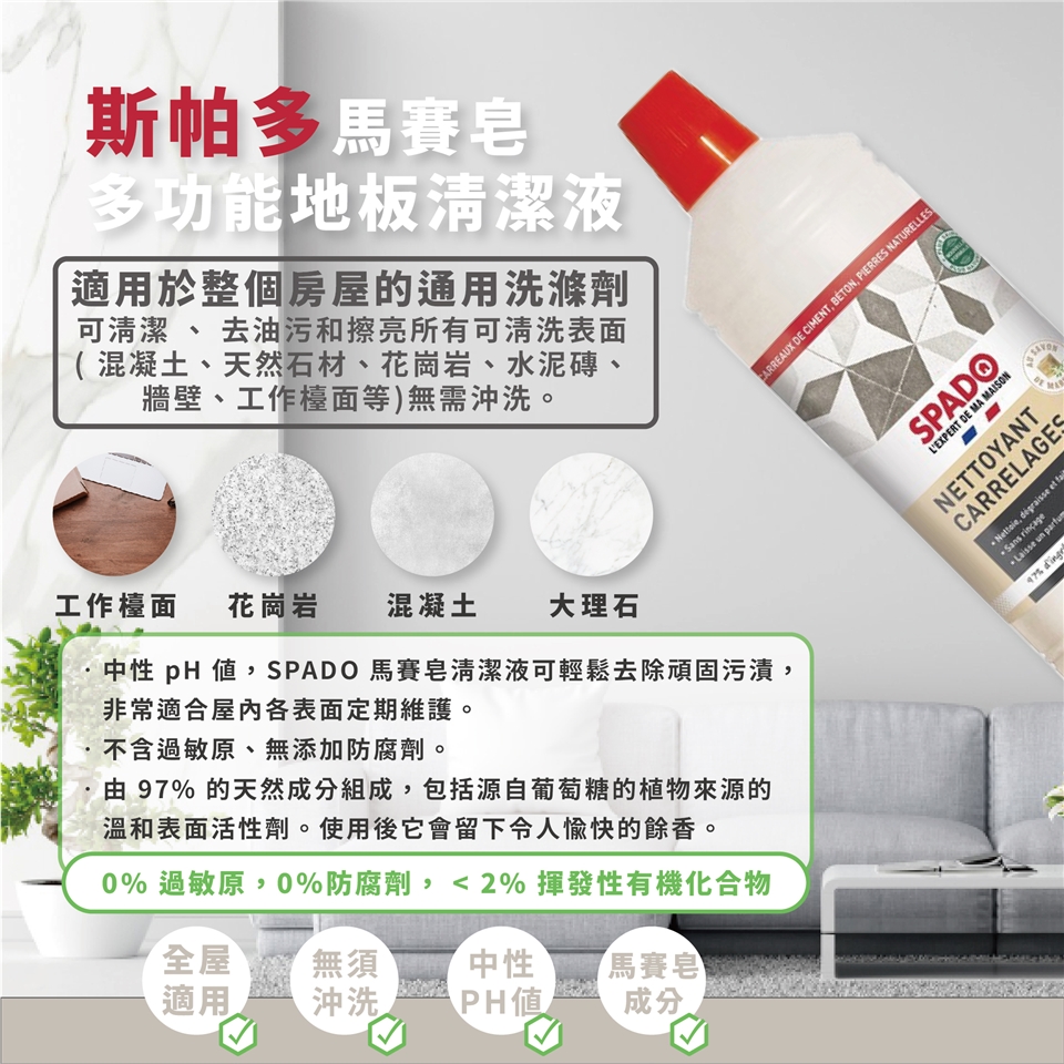• 中性 pH 值,SPADO 馬賽皂清潔液可輕鬆去除頑固污漬,非常適合屋內各表面定期維護。