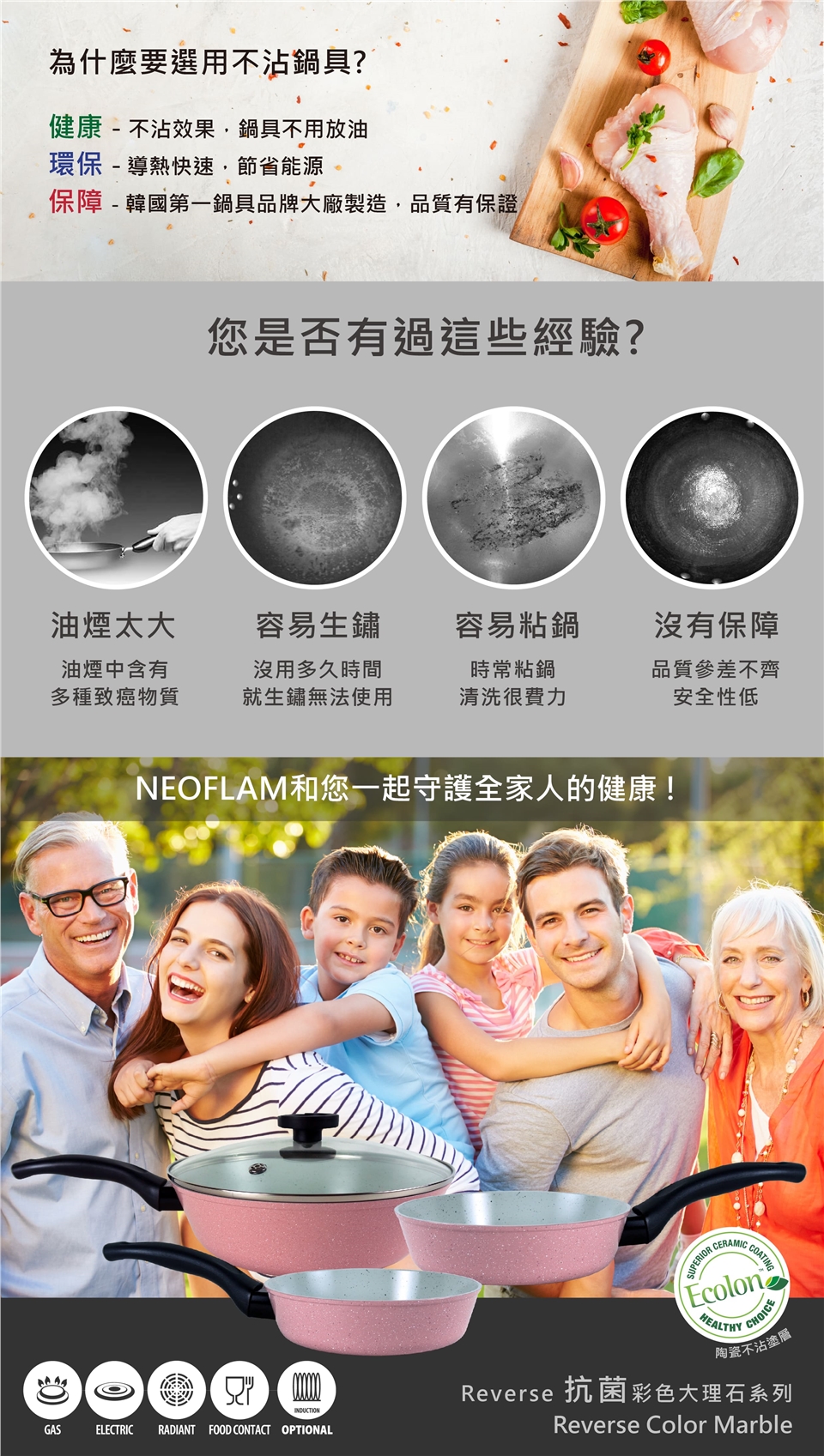 ●可適用於瓦斯爐、電爐、鹵素爐、電磁爐,不適用於微波爐