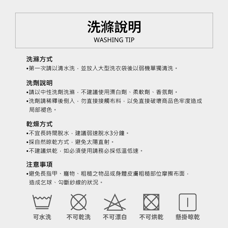 使用中性洗滌劑,勿使用柔軟精/漂白劑