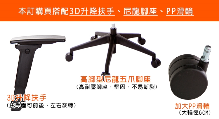 本訂購頁規格:3D升降扶手、山形尼龍腳座、PP滑輪