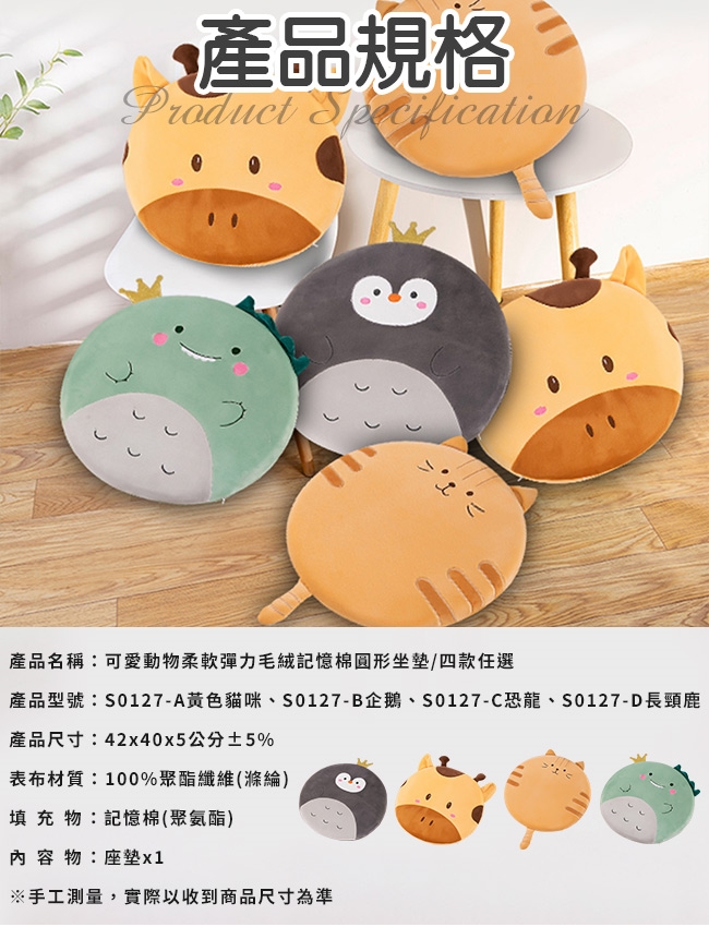 產品型號:S0127-A黃色貓咪、S0127-B企鵝、S0127-C恐龍、S0127-D長頸鹿
