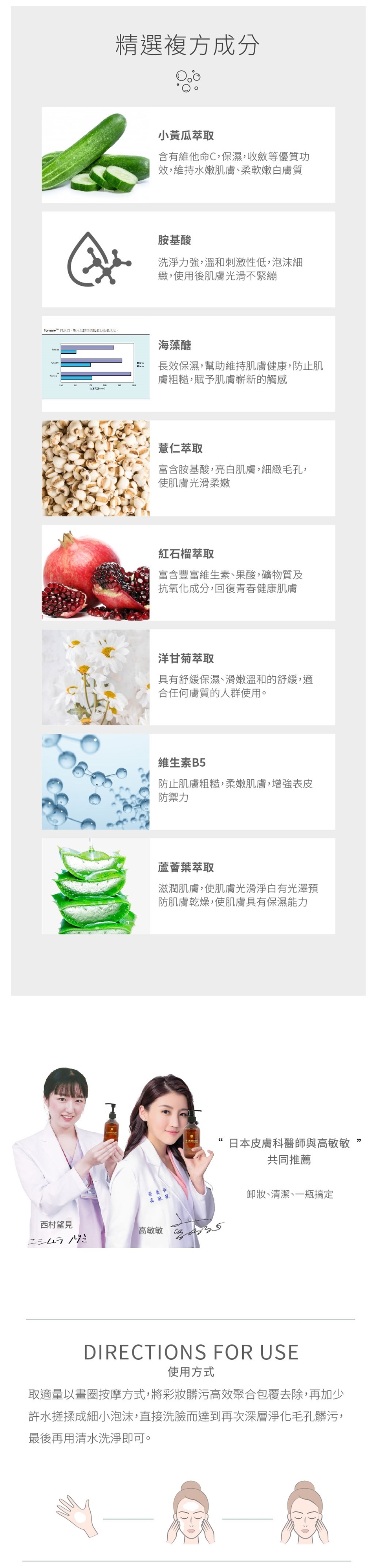 1.卸妝 – 此產品利用凝膠的特殊性,藉由臉部膚溫及直接畫圈按摩方式,使凝膠與肌膚達到完全密合後,產生白色黏綢絲狀物,徹底黏附彩妝、老化角質或髒污…等。