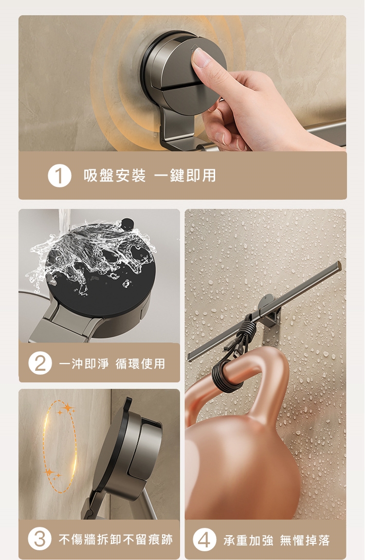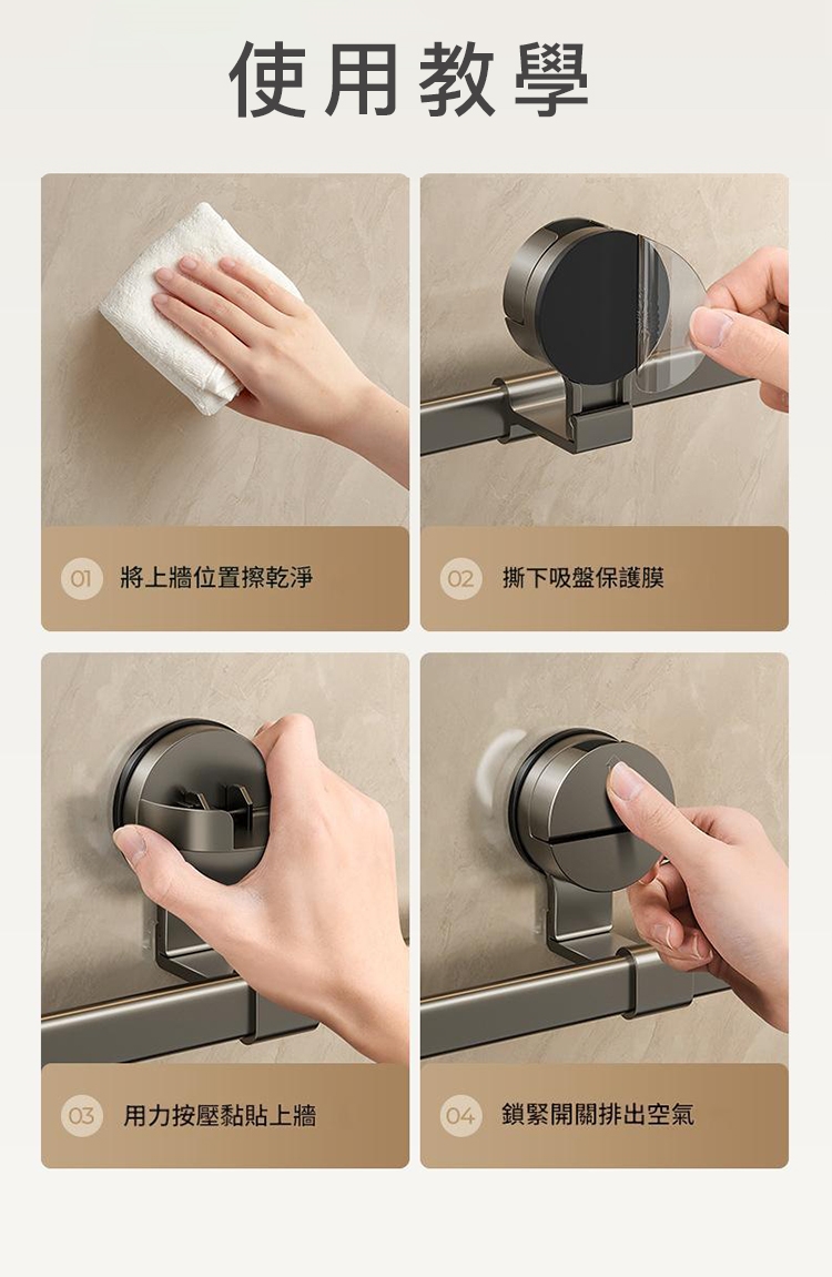 5.安裝前請保持牆面乾淨且無塵,撕開吸盤保護膜後, 貼牆面按壓緊實並排除空氣,順時針旋轉扭緊固定