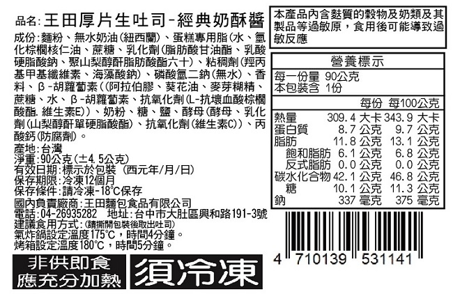 本產品內含麩質的穀物及奶類及花生及其製品等過敏原,食用後可能導致過敏反應