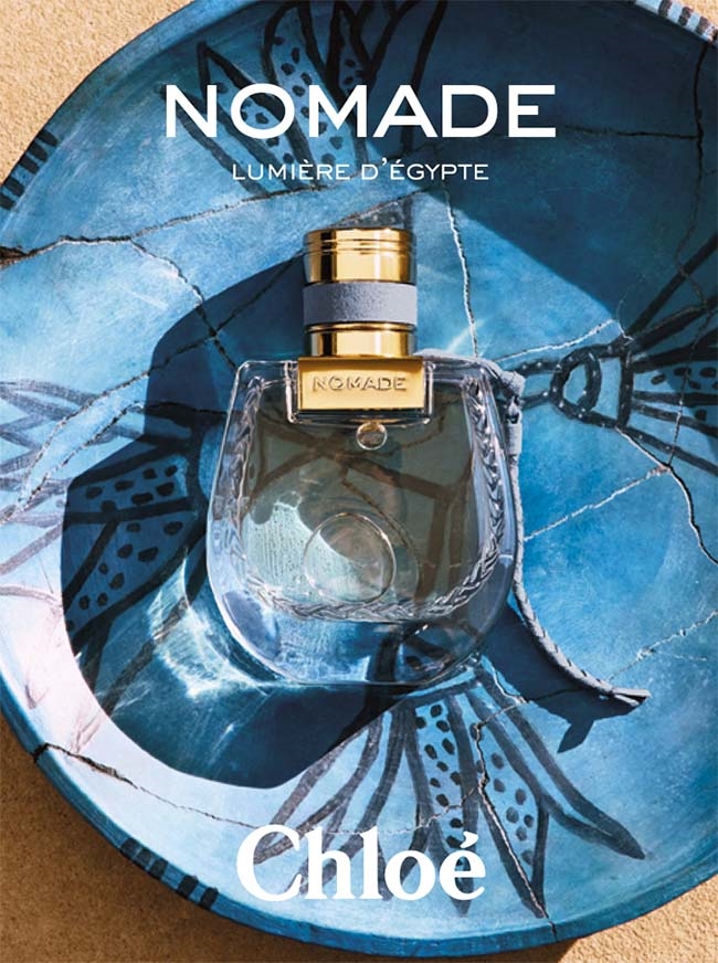 在宣傳畫面中,香水瓶被拍攝於一背景中,背景是古老陶器風格的陶瓷盤,這些盤子釉色深邃的地中海藍,並且裝飾著繪有蓮花的圖案。