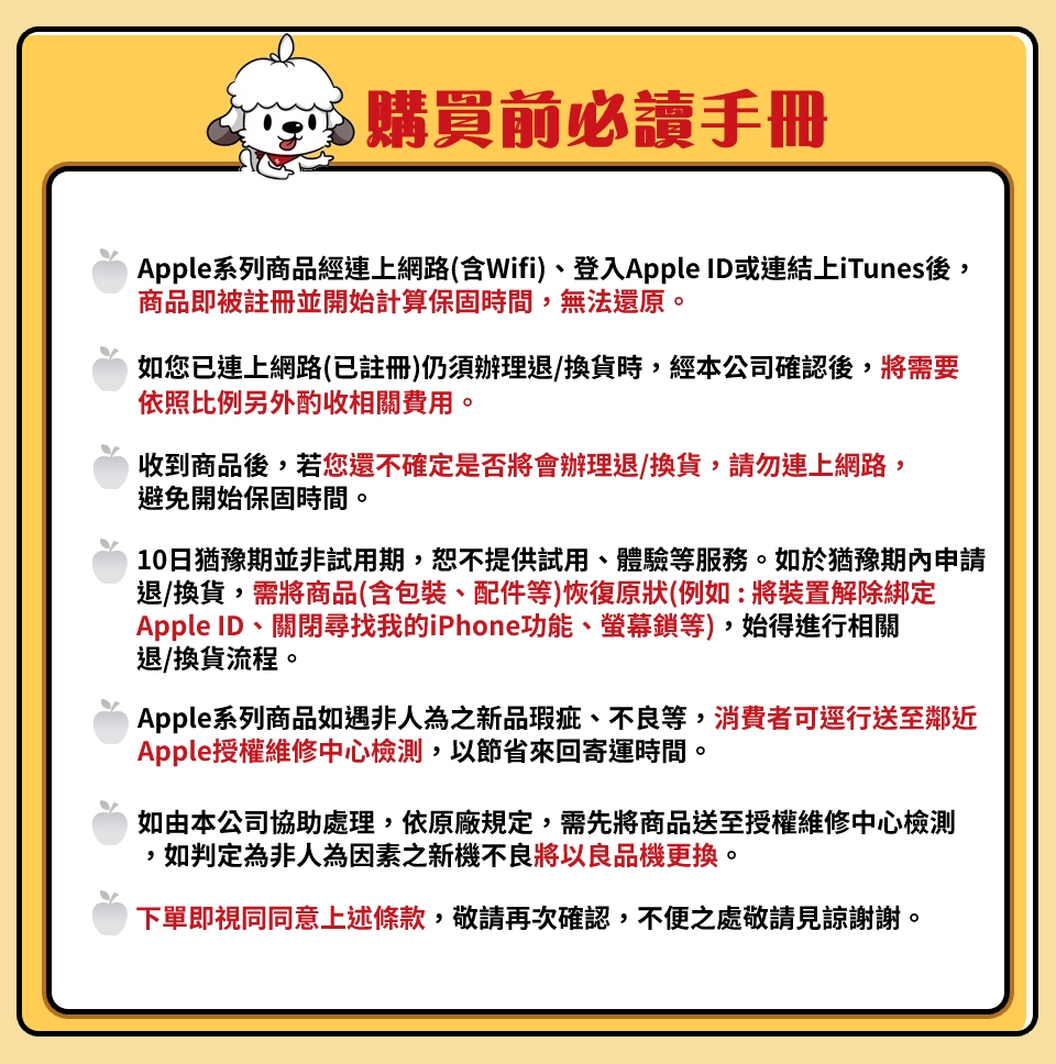 4.10日猶豫期並非試用期,恕不提供試用、體驗等服務。如於猶豫期內申請退/換貨,需將商品(含包裝、配件等)恢復原狀(例如 : 將裝置解除綁定Apple ID、關閉尋找我的iPhone功能、螢幕鎖等),始得進行相關退/換貨流程。